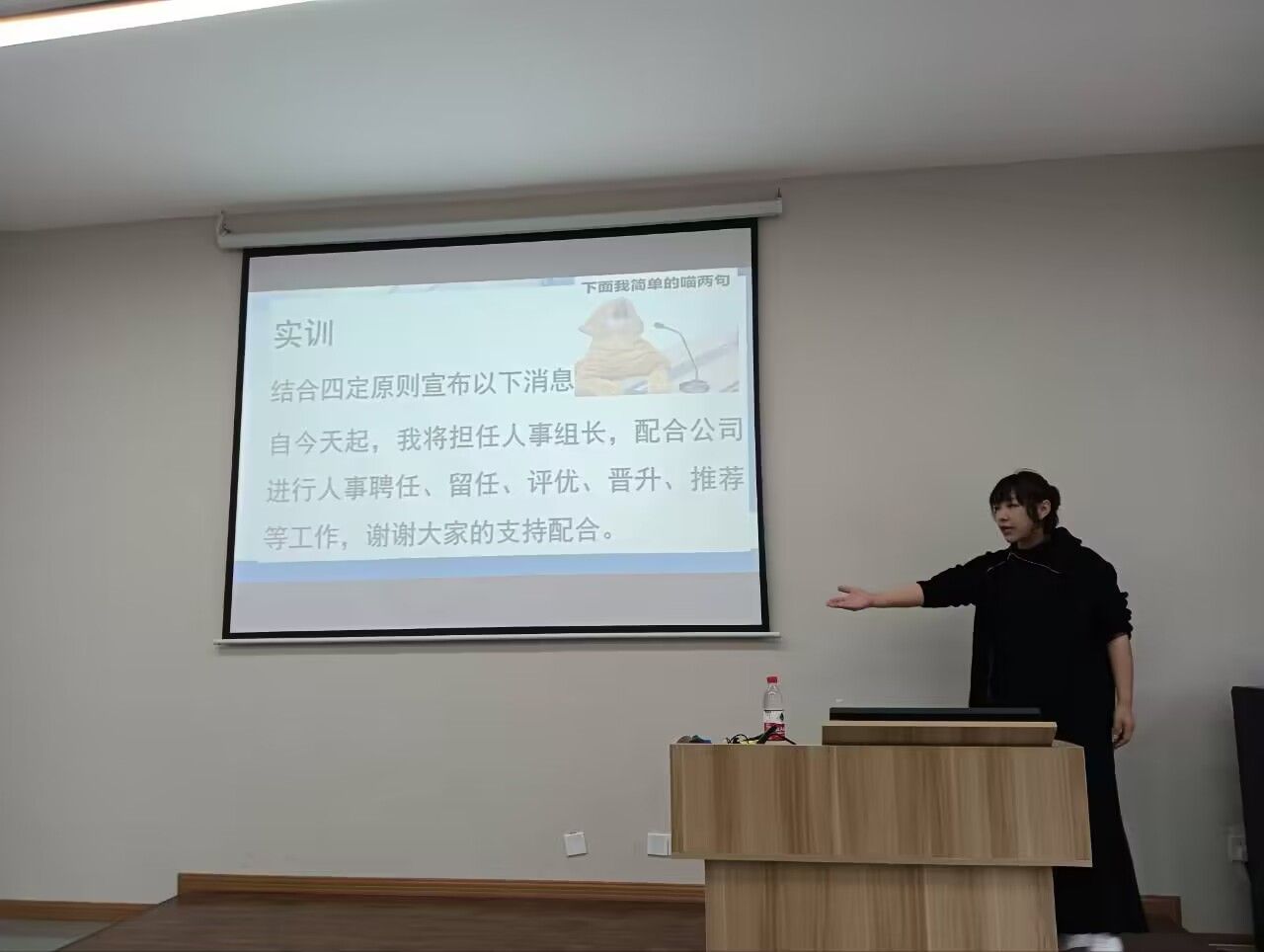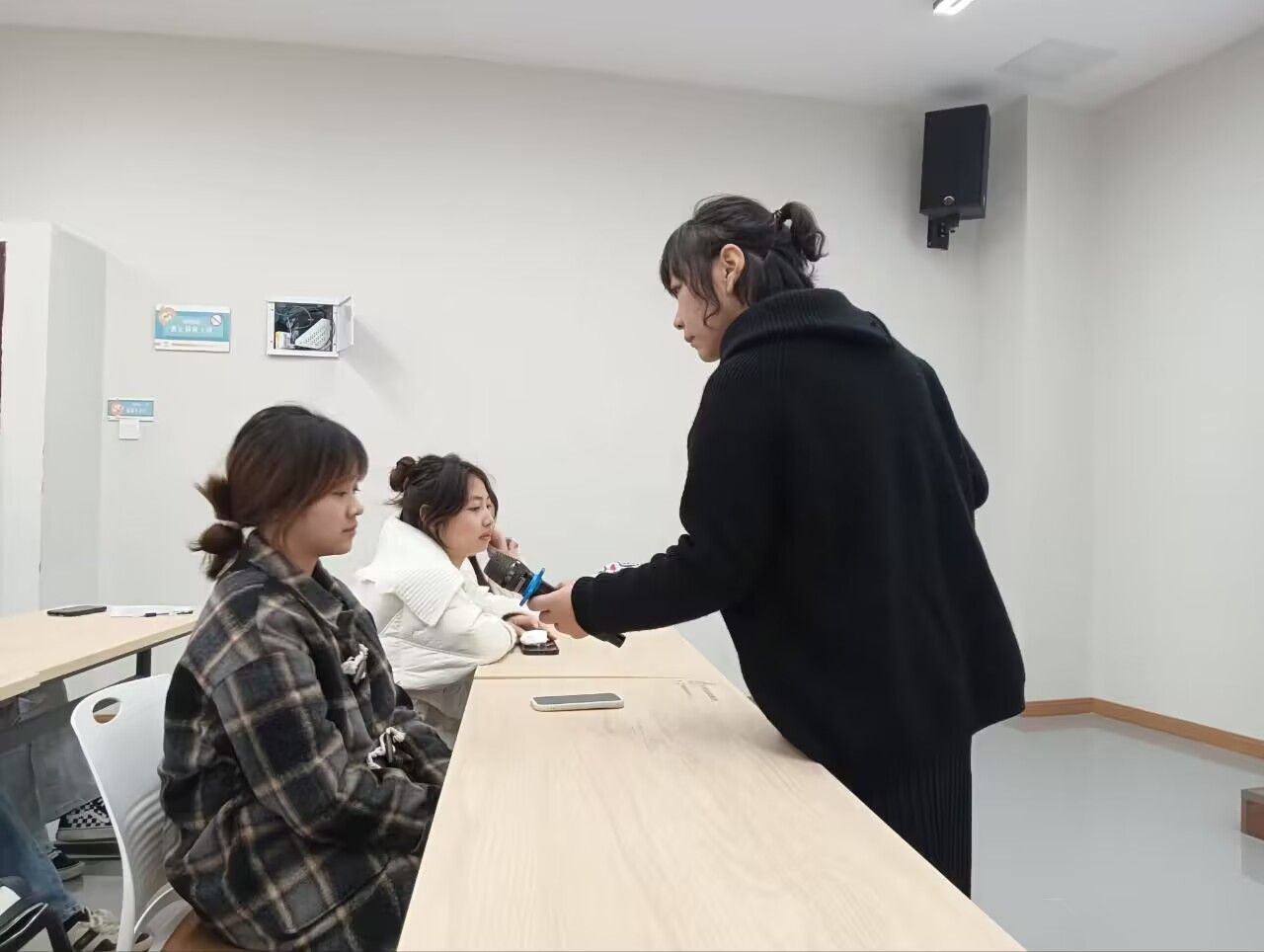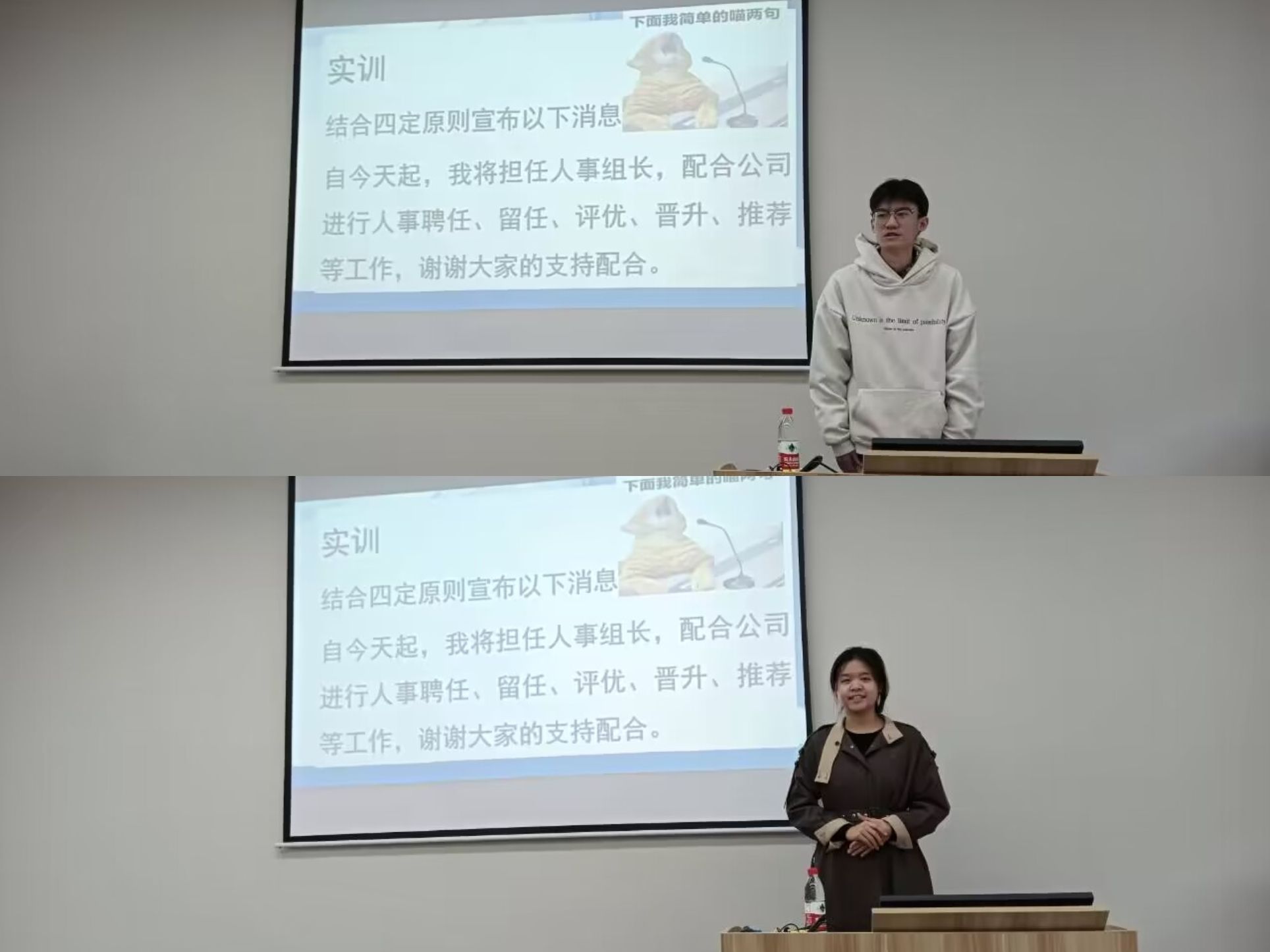 在互动环节中,同学们不知如何加强对于自身控场力的把控,针对这个问题,田一洁老师给同学们介绍了四个控场小技巧:提问法、互动法、自嘲法和转移法。同时,田一洁老师亲身带领同学们进行关于控场力的训练,并请同学上台,用学习到的四定原则进行演示互动。同学们在老师的指导下,感受到了自身的不同之处,体会到了控场力的魅力所在。