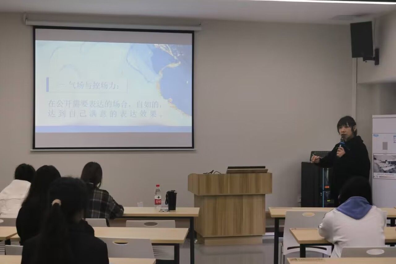 一个强大的气场是培养控场力的核心所在。田一洁老师表示,气场来源于自信,即同学们对自身的了解和认可,建议同学们在大学生活中不断提升自我能力,发掘自身优点,在公开需要表达的场合,自如的达到自己满意的表达效果。同时,田一洁老师认为在锻炼自身控场力时,要加强自身对于环境的敏锐洞察和人际关系的理解,从而更好把握氛围的变化,掌握全局的节奏。