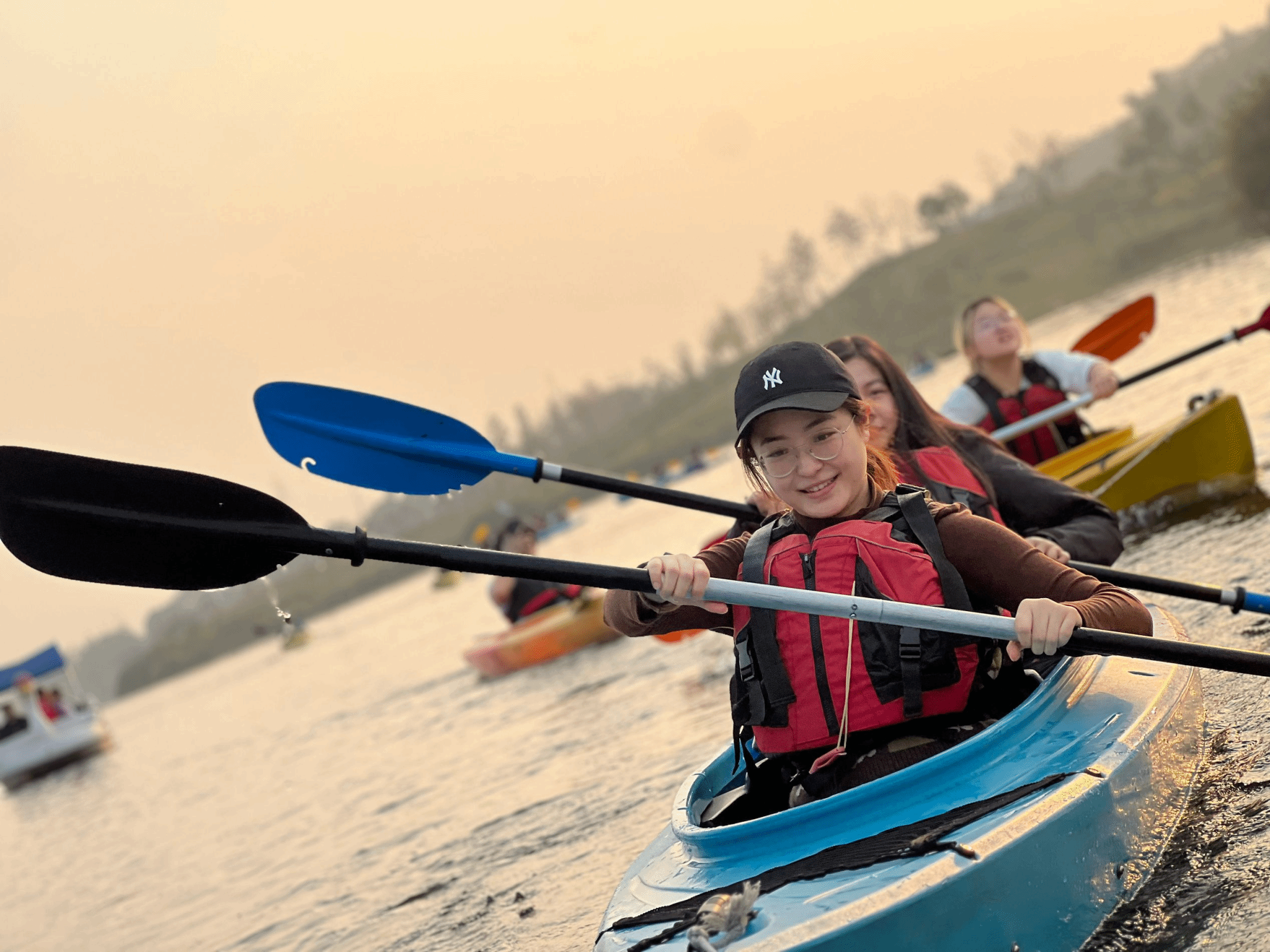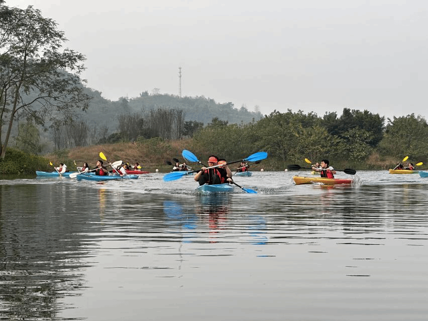 在参观完历史后,师生们继续探寻团队协作的魅力,来到了两江新区红帽子皮划艇基地。在皮划艇基地,专业教练细致地为老师和同学们讲解皮划艇的操作方法。老师和同学们热情洋溢,迫不及待地要投入到这个充满挑战和乐趣的水上运动中。分为两组进行PK。他们在湖面上翻滚的水花中,感受到了团队合作的紧密联系,形成了一种集体向心力。