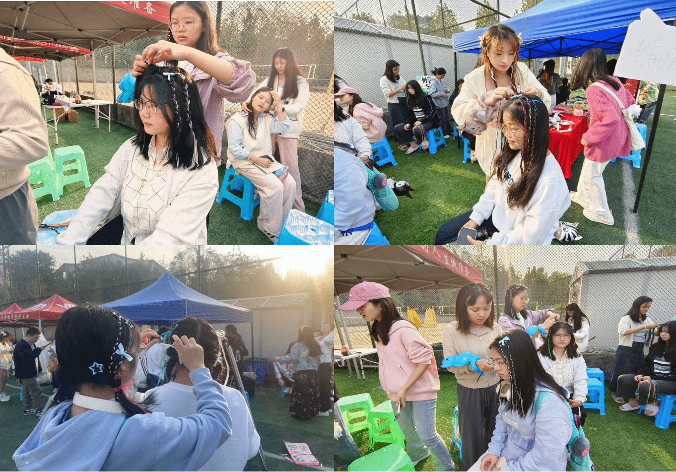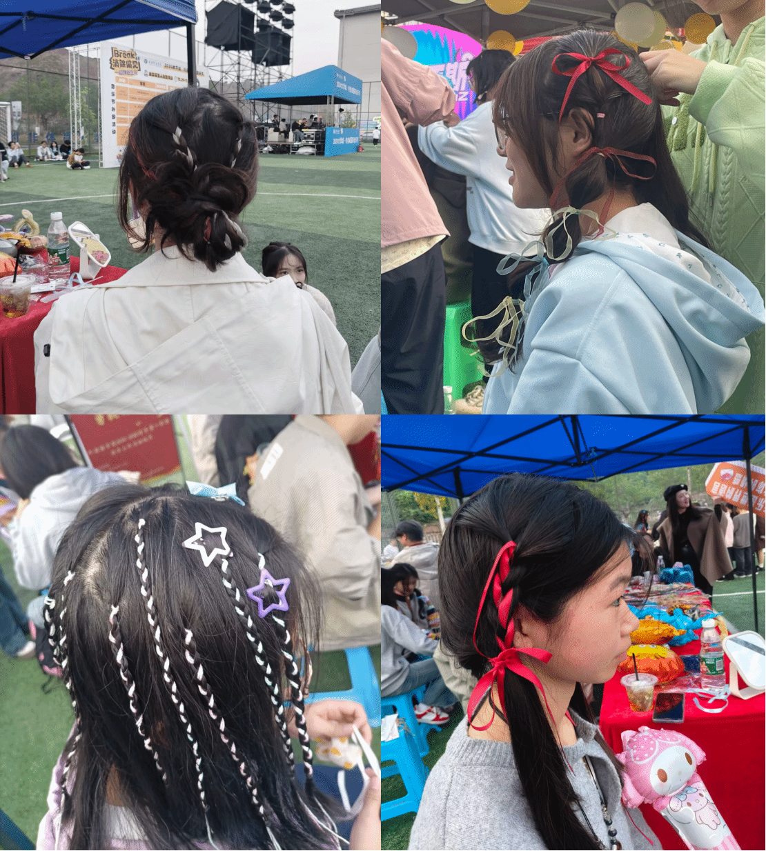 在大家沉浸式的参与下,精美的彩绳编发作品逐渐成形。参与者们将彩绳编织成美丽的发带,有的则将其巧妙地融入辫子之中,在这个过程里,有些同学遇到了困难,但在经过询问工作人员和与周边其他编发的同学讨论后成功解决了,更有得心应手、经验十足的编发大师在场,三下五除二就编出了令人惊叹的作品。每个人的作品都是独一无二的,它们不仅展示了个人的创造力,更成为了这个夜晚的美好纪念。