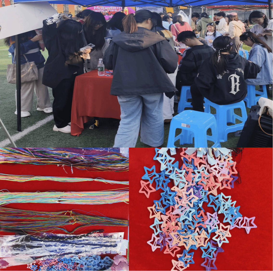 随着活动时间的临近,参与者们陆续抵达现场,现场气氛活跃,秩序井然。工作人员们耐心地向大家介绍彩绳编发的基本技巧,参与者们围坐成一圈,认真聆听。从简单的结扣到复杂的图案编织,每一步都充满了创意与乐趣,随着工作人员的讲解,大家迫不及待地开始了自己的彩绳编发创作之旅。同时,除了鼓励同学们自己动手设计编发造型,我们的工作人员也会根据参与者的想法为她们花式编发。