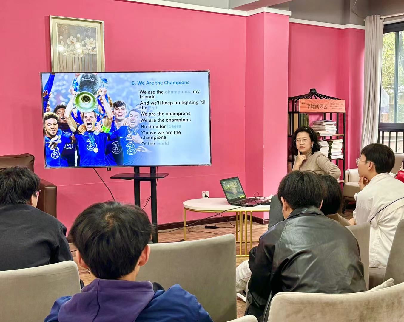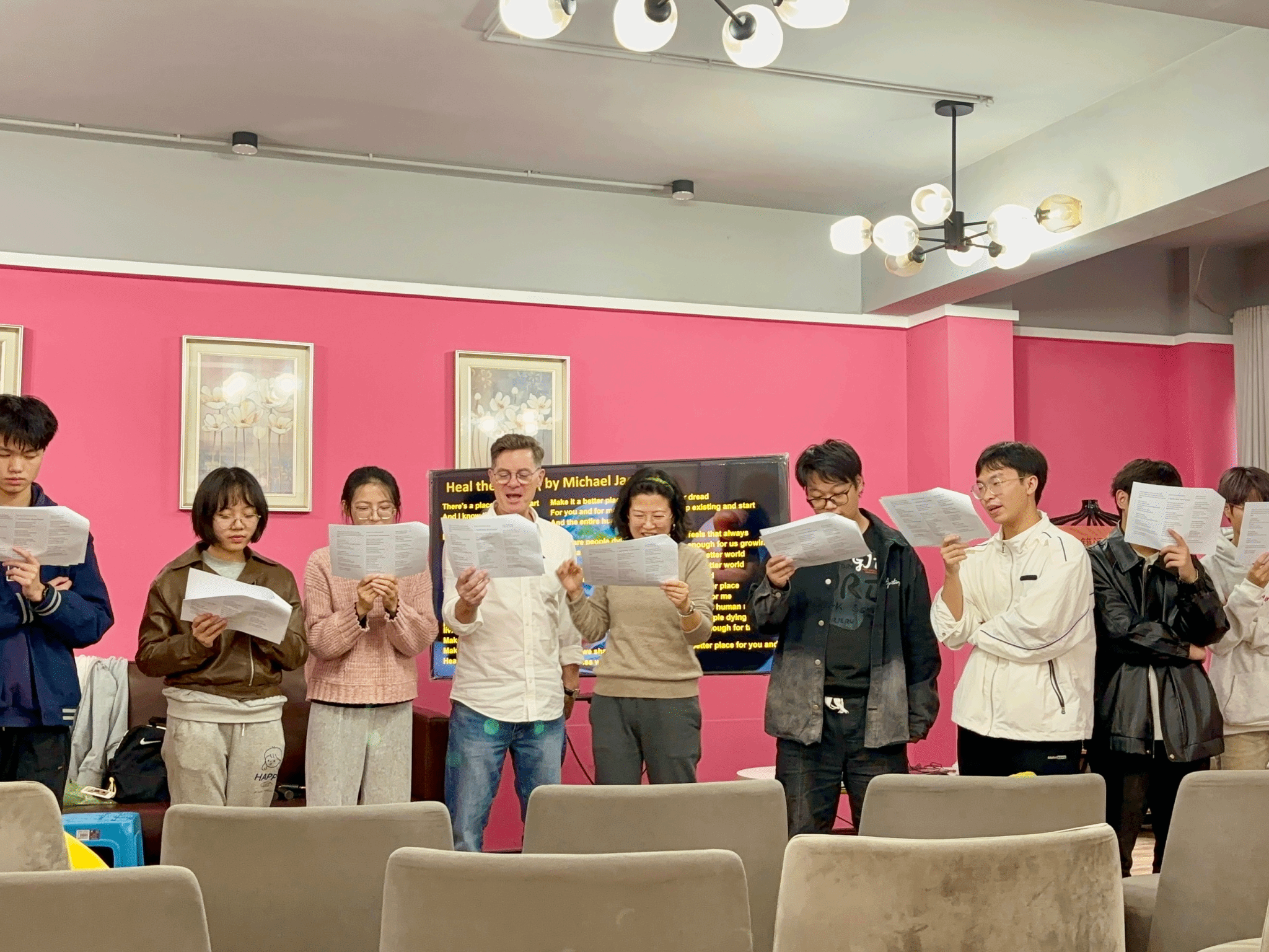 分享之外,为了更加带动同学们的情绪,杨沁霏老师分享了自己喜爱的音乐并且组织大家进行合唱。同学们伴随着一个个音符,一段段旋律,大家齐声歌唱。《Row, Row, Row Your Boat》虽是一首儿歌,但作为合唱前的热身曲目,其欢快轻松的旋律,让大家立刻放松下来; 旋律悠然,大家不禁随音乐摆动,不亦乐乎。动听的歌声充满了整个房间,大家共同享受着音乐带来的快乐;那一刻是一群人的情绪共振。立冬过后,温度渐低,冬天的气氛越来越浓厚,大家合唱一首 George Michael的《Last Christmas》,节奏欢快,画面温馨,为初冬增加了几分暖意。