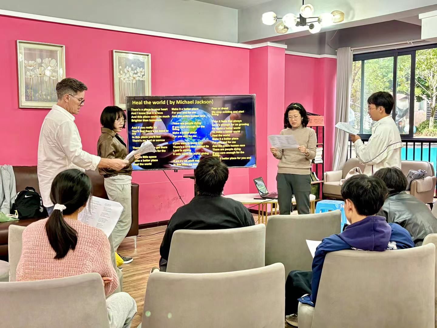卢涵同学更是积极踊跃身当领唱,她舒展歌喉,带领其他同学共同沉醉于音乐的世界。这样的勇气和主动,让大家感受到了她对音乐诚挚的爱。在她的带领下,大家的心中增添了几分自信与底气。本次活动在大家合唱麦克杰克逊(Michael Jackson)的经典曲目之一《Heal the world》中结束。这首歌呼唤和平、呼唤友爱;呼唤人与人、国家与国家之间应有的信任、美好和互助;以及我们对绿色地球家园的热爱、珍惜及保护。