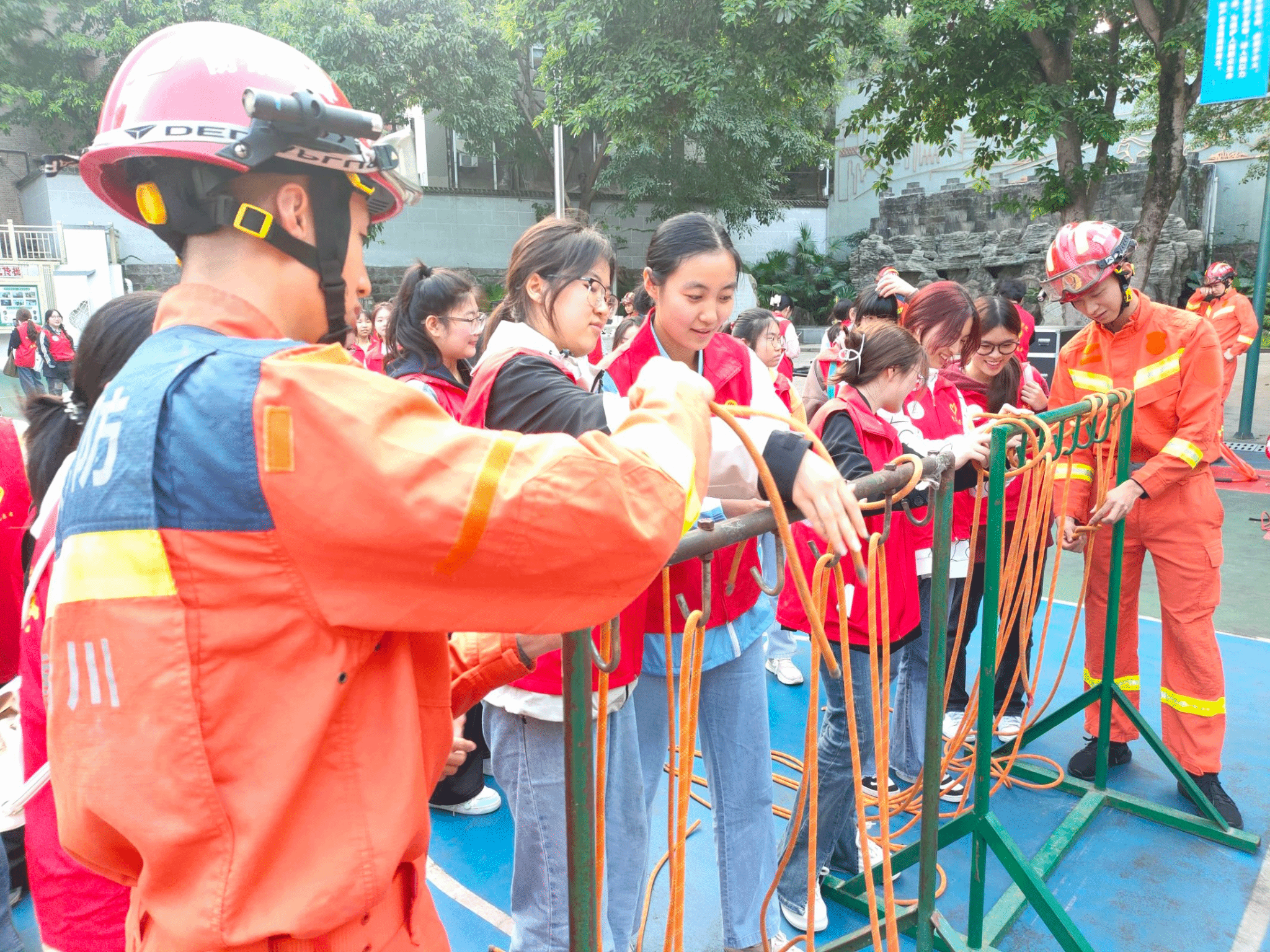 小小隐患,易酿大祸。为让学生们更深刻地了解消防安全知识,消防员引领引领学生们与消防设施进行零距离接触。首先消防员们指导同学学习结绳。并不是生活中常见的普通结绳,而是在消防救援中至关重要的技能。消防员展示结绳的多种结法,每一种结都有其独特的用途,感受其中安保的意义。接着让学生们切身体会灭火战斗服体验。灭火战斗服是消防员在面对熊熊烈火时的重要防护装备,它具有防火、隔热耐磨等多种功能。大家可以在消防员的协助下,穿上重达数十斤战斗服,感受它的厚重与坚实。