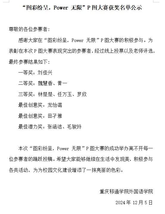 为落实我校完满教育理念,培养移通学子个性发展,推动特色文化的多样化发展,增强外国语学院同学们的审美能力,2024年11月24日-12月4日于线上举办本次“图彩纷呈,Power 无限”P图大赛。