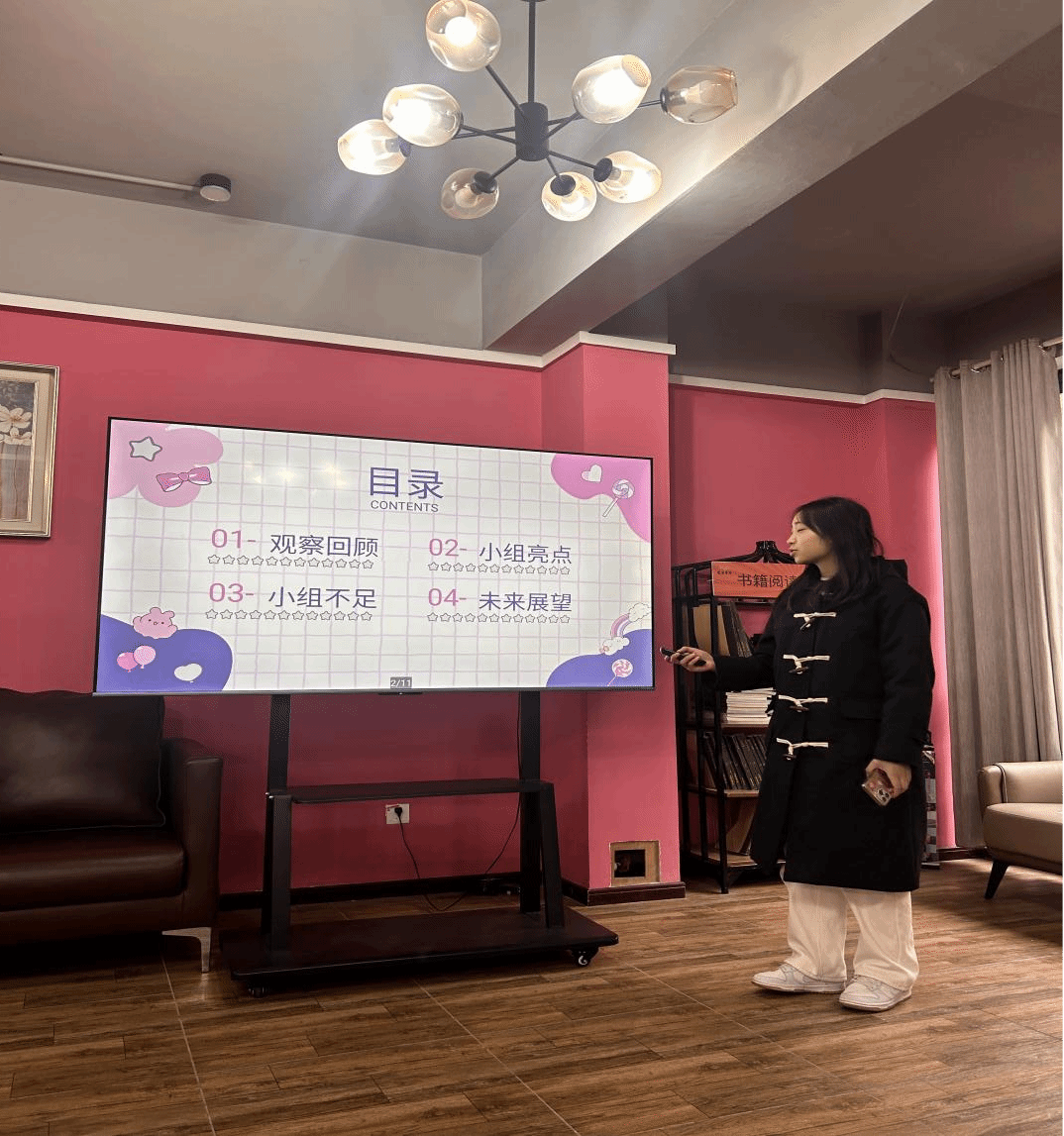 活动序幕轻启,各小组率先登台,为本学期的观察之旅编织总结的锦缎。小组代表们携精心准备的 PPT,如本学期观察回顾,将观察成果以全景式、多维度的视角徐徐铺陈。各小组组长有条不紊地就本学期工作展开总结汇报。他们不仅详实地展示了本学期所观察活动的全貌以及小组斩获的各项成果,还深入透彻地剖析了小组工作的亮点与优势。与此同时,亦毫不避讳地指明了现存的诸多缺陷与不足,并高瞻远瞩地提出了对未来工作的设想与规划,为团队的持续发展绘制了清晰明了的蓝图,指明了前行方向。
