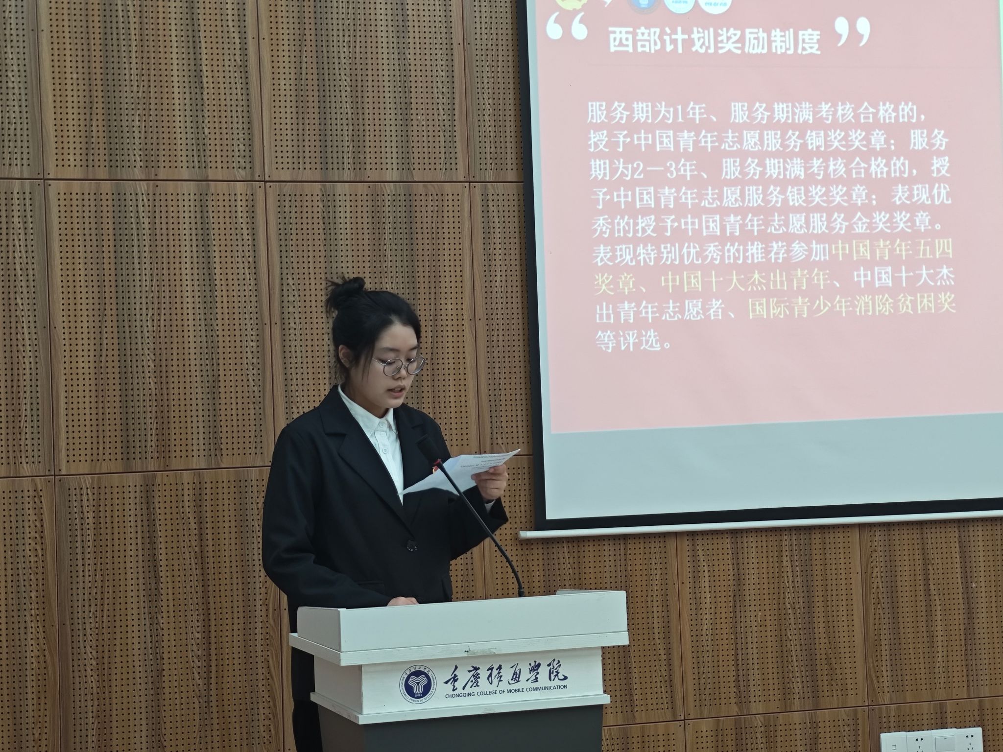 西部计划,宛如一颗闪耀在祖国广袤西部大地上的希望之星,承载着无数青年的热血梦想与时代使命。为积极响应国家号召,大力推动西部计划在校园中的深入开展,让更多有志青年投身西部建设的伟大事业,重庆移通学院外国语学院于2024年12月26日,在天渠111举办以“闪耀青春·逐“西”前行”为主题的2025-2026年度西部计划招募宣传系列活动。