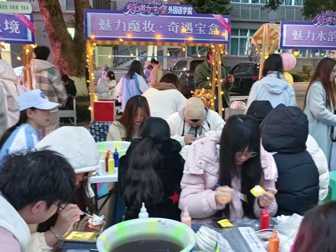 “她走在美的光彩中,如夜晚皎洁无云而且繁星满天。”女性是熠熠生辉的存在,用善良与勇气、智慧与力量,书写着独一无二的人生篇章。为全面活跃同学们校园文化生活,丰富同学们的精神世界,更好的展现当代女大学生的青春靓丽、积极向上之风采;让大家能够积极地参与活动,有更多自信去表达自我、展示自我,促进同学间真挚交流,发现自身美好与独特,收获惊喜与感动。外国语学院青年志愿者协会安心志愿服务支队于3月7日和权益部一起在黄桷树广场共同开启一场展现女性美好的集市摊位活动,充分融入女生节这一热闹氛围。