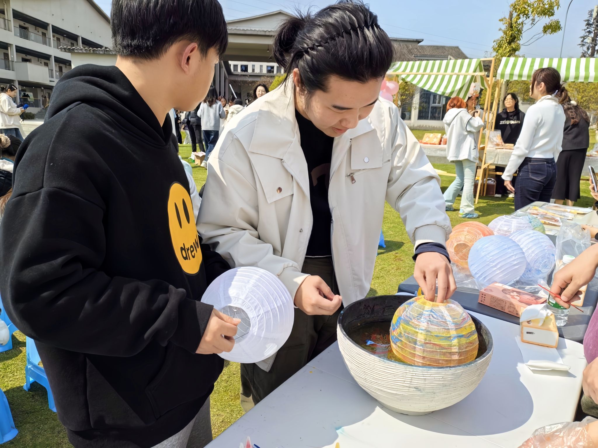 在这春日的暖阳下,草坪的另一边还安排了灯笼漂漆活动。同学们聚在染缸旁,手握着一只只尚未绽放缤纷色彩的糊纸灯笼,这些糊纸灯笼以纤细的竹篾为骨,洁白的棉纸为衣,散发着淡雅的气息。在明媚阳光的映照下,染缸中的漂漆闪烁着神秘而迷人的光泽。同学们小心翼翼地将自己制作的灯笼浸入染缸,随着灯笼缓缓沉下,漂漆如绽放的花朵般逐渐将其包裹,晕染出绚丽的色彩。春风轻拂,带着花香与墨香交织的气息,展现出中华传统文化的无尽魅力。