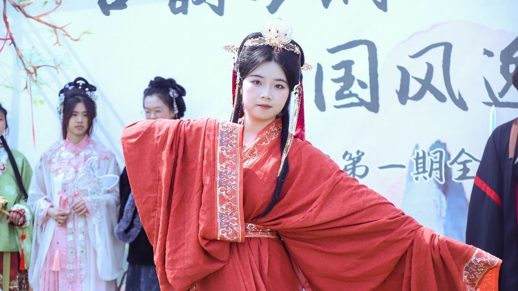 在同学们还在对婉转动听的国风旋律流连忘返之时,活动已经来到了中场环节,华韵汉服协会携数套历代传统服饰惊艳登场。从秦汉曲裾的庄重大气,到唐宋齐胸襦裙的飘逸灵动,再到明代马面裙的华贵典雅。社员们手持团扇、长剑,踏着轻快的背景音乐旋律款款而行。衣袂翻飞间,簪花、璎珞、禁步等配饰泠泠作响,为同学们带来了一场跨越古今的国风视觉盛宴。
