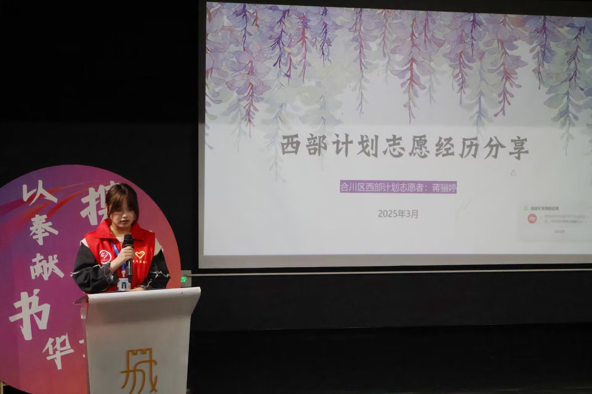 在工作过程中,蒋骊婷充分发挥专业优势,创新宣传方法,不仅让宣传内容焕然一新,还提高当地项目的知名度。蒋骊婷积极参与当地文化建设,组织各类文化活动。这些经历不仅锻炼她的能力,更让她深刻理解志愿服务的意义,收获珍贵的人生财富。蒋骊婷的分享,让在场同学真切感受到西部计划的独特魅力与深远价值,赢得阵阵掌声。