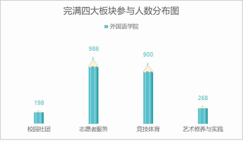 在外国语学院的完满教育活动中,志愿服务活动参与人数较多,有988人参加,校园社团参加人数为198人,竞技体育参加人数为900人,艺术修养与实践参与人数为268人。