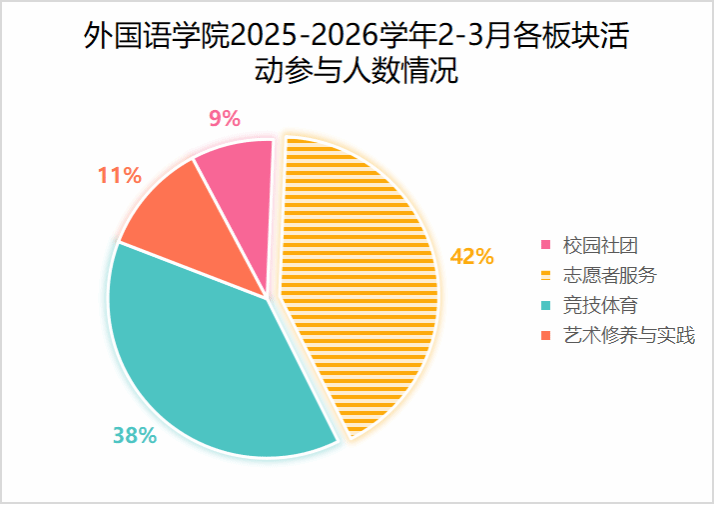 外国语学院2-3月指尖派线上平台共开展40场活动,涵盖志愿服务、艺术修养实践、校园社团活动、竞技体育活动等四种类型,共计参与人数2354人次,活动平均参与人次为58人。