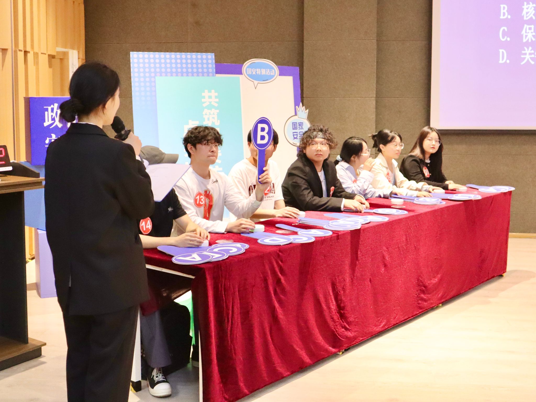 随着主持人宣布活动开始,正式进入“知识抢答抢答”环节。十四位参赛选手以笔为戈、以智为盾,展开"毫秒级"脑力角逐,选手们以扎实储备与敏捷思维诠释新时代青年的国安素养,思维的火花在迸发,现场瞬时凝结为无声战场