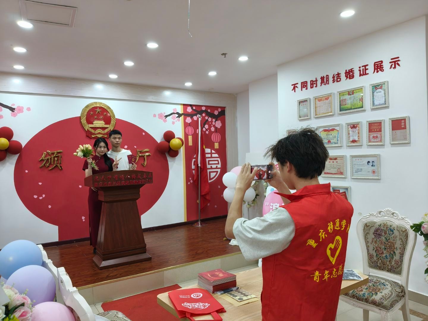 五月,阳光灿烂,爱意弥漫,恰逢“520”这充满希望与美好的日子,婚恋如同璀璨星辰,承载着人们对美满生活的向往。而志愿服务似温柔暖风,传递着关爱与力量。为助力新人迈向幸福婚姻旅程,弘扬和谐婚恋理念,重庆移通学院外国语学院青年志愿者协会 “渝爱” 婚恋志愿服务专项支队于5月21日在合川民政局开展一场别开生面的志愿活动,为新人们的爱情增添温暖与祝福。
