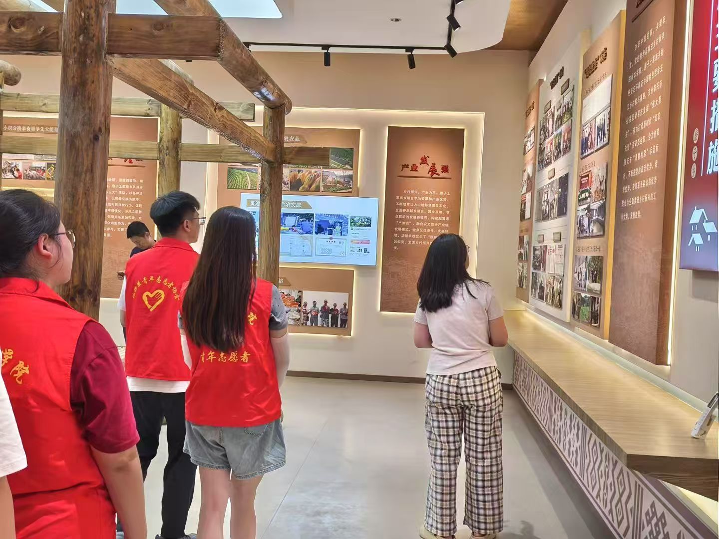 接着,推普实践团又开启了乡村振兴示范走廊探访之行。沿着整洁的步道前行,团队成员依次参观产业发展、生态治理、乡风文明等主题展区。展板与图片里,字字记录着构建“产加销”融合农文旅产业链的历程;步步践行着“绿水青山就是金山银山”理念。竹山村以红色文化为魂、生态资源为基、产业发展为要,蹚出乡村振兴新路径。如今,这里不仅吸引了游客前来感受田园魅力与民族风情,还带动了特色产业增收,让同学们触摸到乡村振兴的实践脉络,深刻理解生态、文化、产业融合发展的价值。