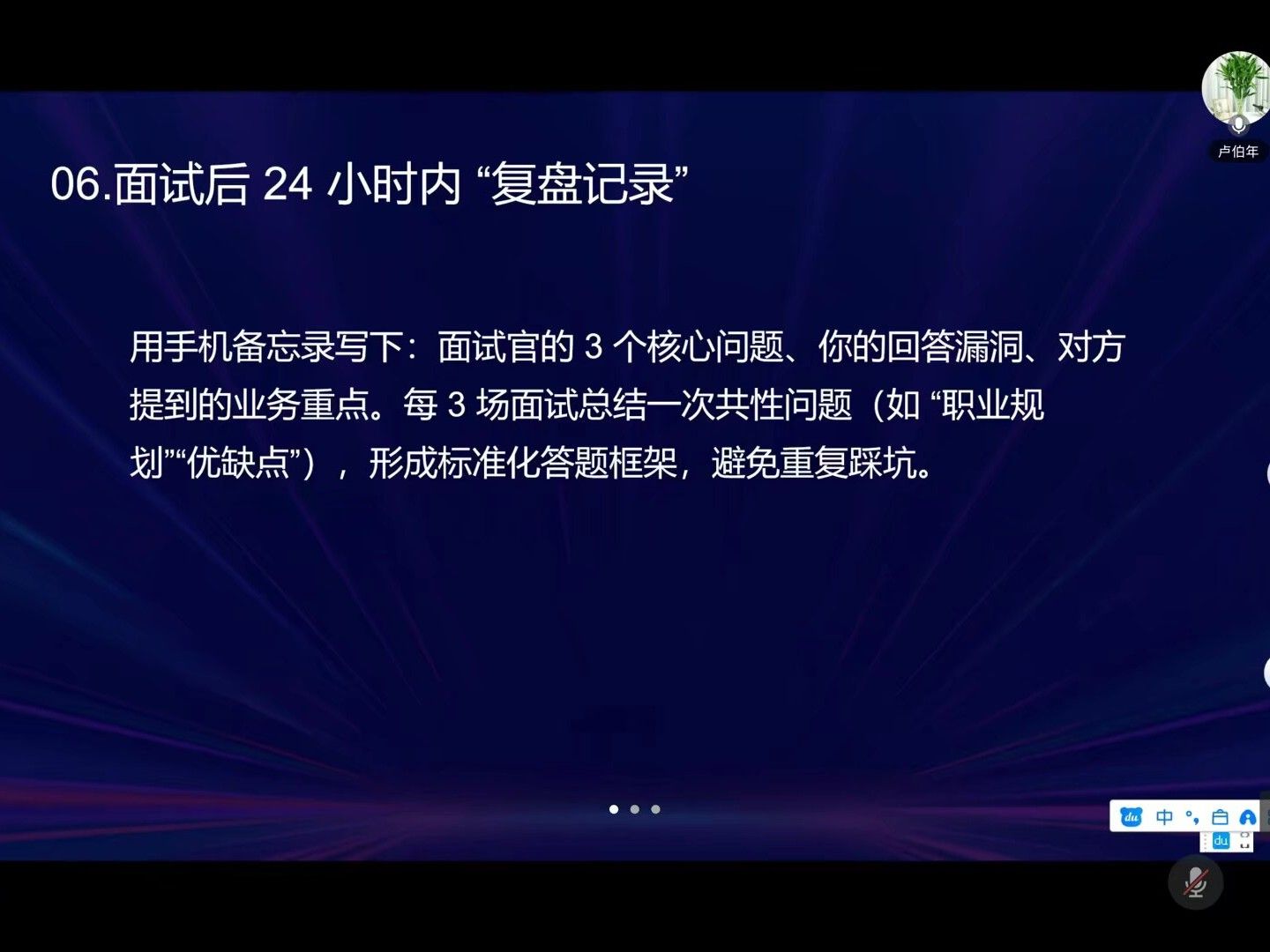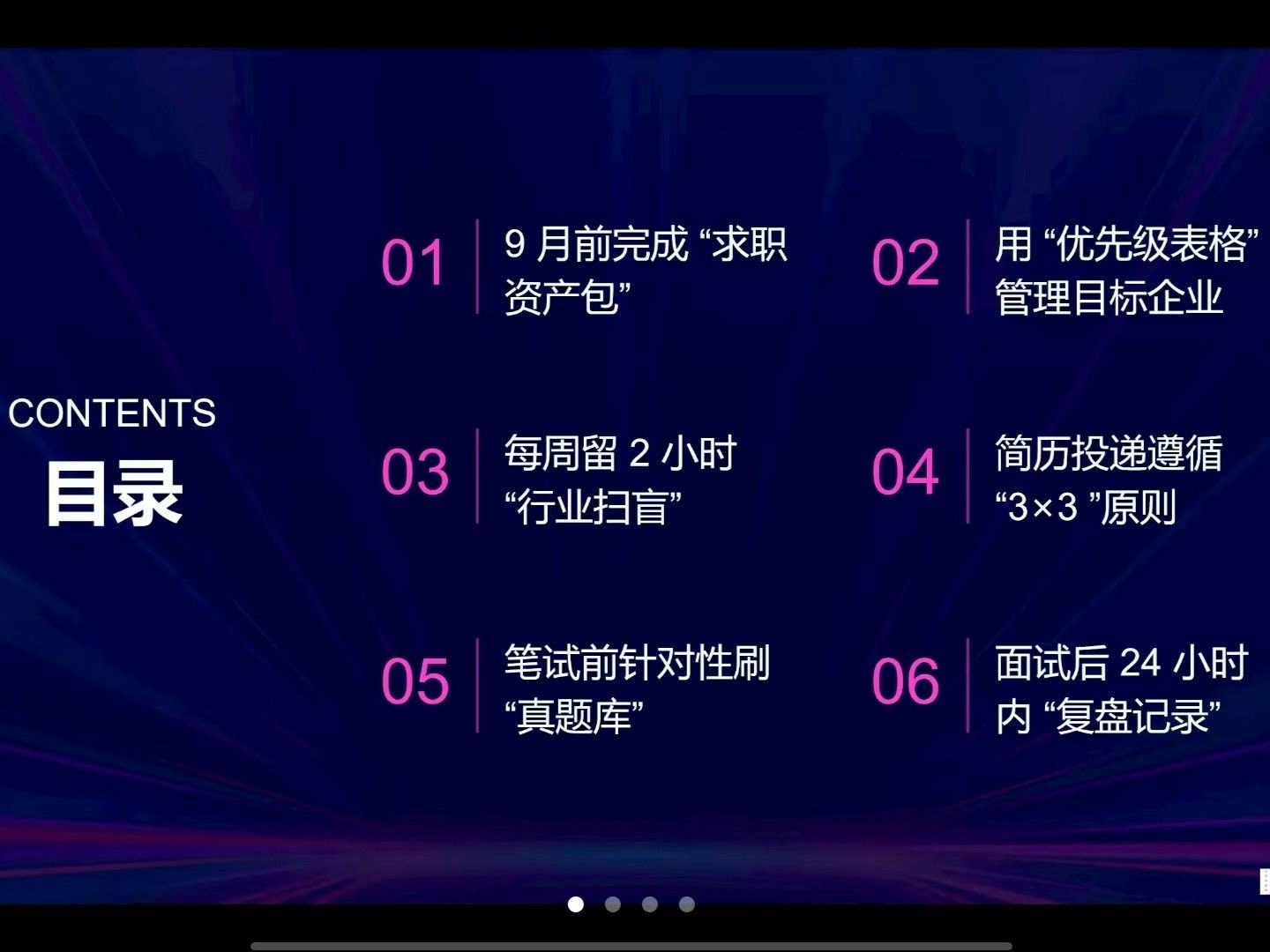 为让同学们深入行业,老师还强调了每周预留2小时“行业扫盲”,通过一些研究报告、企业动态追踪,筑牢对行业的认知根基;简历投递遵循“3×3”原则,提升投递命中率;面试后也有“黄金动作”——24小时内完成“复盘记录”,为后续面试积累经验。