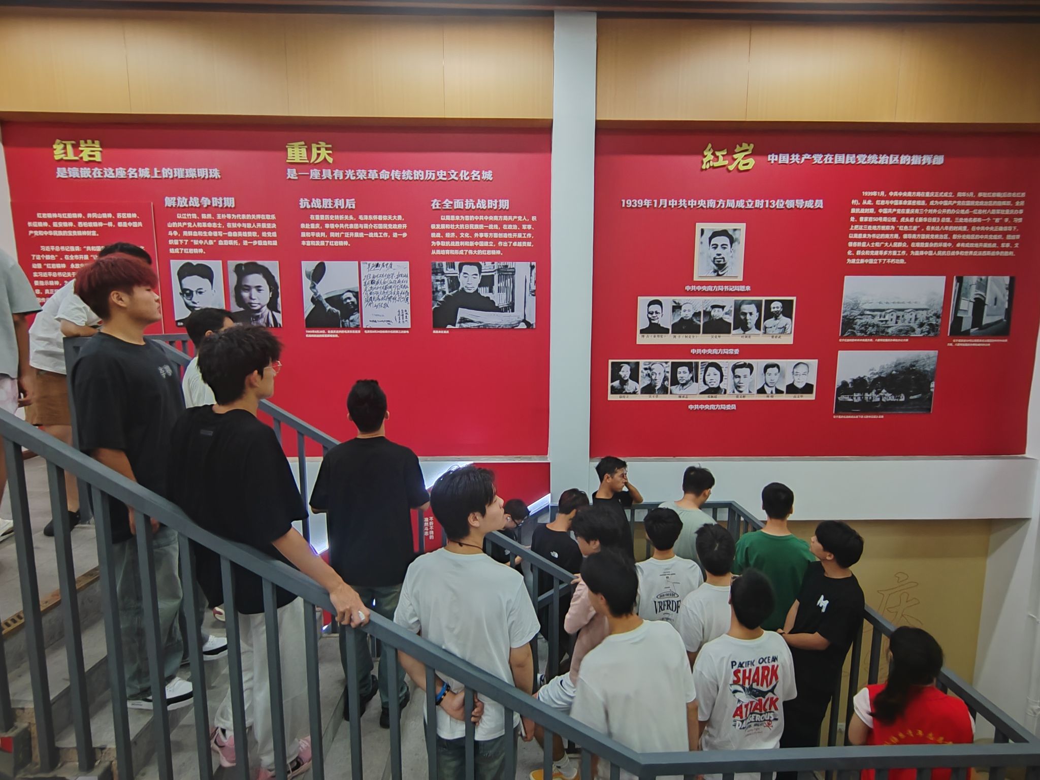志愿者以“红岩思政馆里的每一个字,都藏着信仰的密码”拉开序幕,带领智能工程学院新生沿“红岩思政”“光影红岩”“VR 红岩”“艺术红岩”“红岩剧本杀”五大板块展开讲解。站在红岩精神内涵展墙前,志愿者深情讲述:“陈然烈士在狱中用铅笔头刻写文稿,每页仅印30份却传遍山城,这油墨里浸透着共产党人的气节,更是红岩精神的忠贞不屈和坚定信仰”。谈及艺术红岩的创新探索,志愿者讲述了原创音乐剧《破晓之前》的创作故事:“主创团队奔赴歌乐山、深入渣滓洞调研,将合川红色故事融入党史教育,以摇滚说唱元素与‘开放留白’设计赋予历史新活力。”2025级张同学凝视着音乐剧感慨道:“原来课本里的红岩不是抽象符号,而是有温度的故事。”
