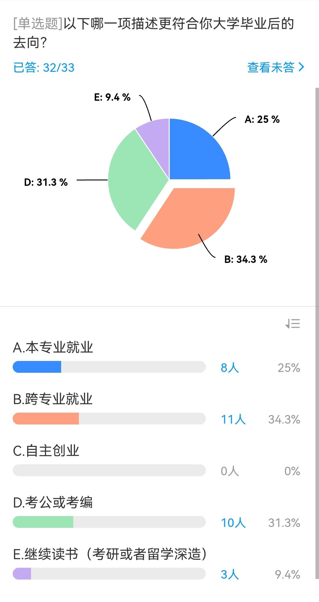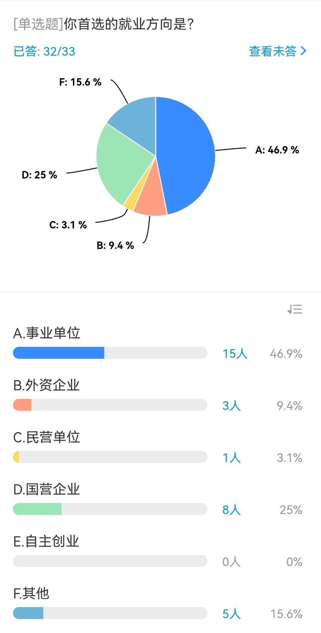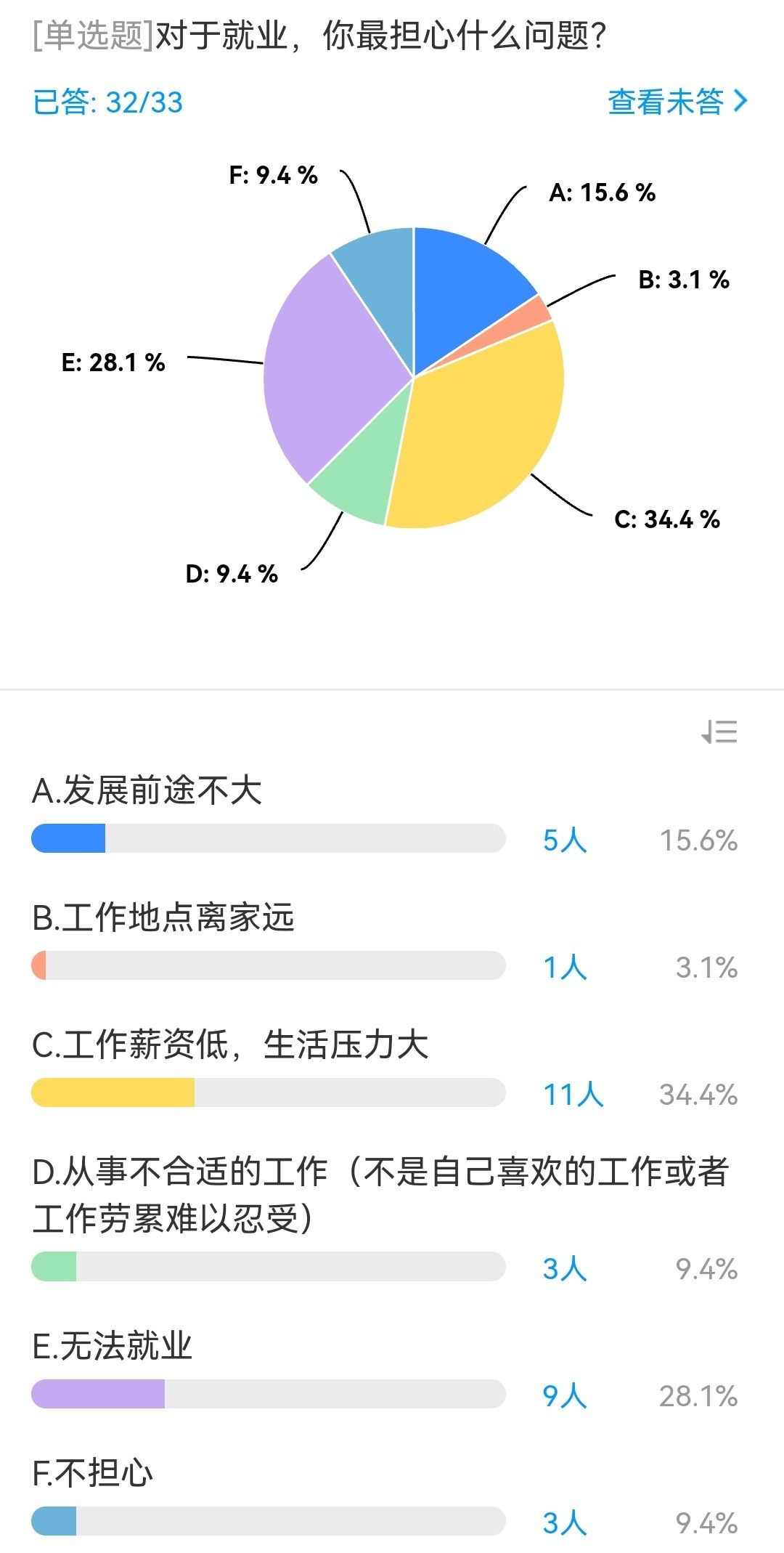 活动伊始,教师结合前期观察到的学生择业焦虑,如“除了老师还能做什么”“担心专业不对口”等问题,点明活动目的,迅速拉近与学生的距离。随后,通过学习通发布调查问卷,了解同学们的就业意向、就业担心的问题、期望的薪资、期望去的城市等等,引导同学们从审视自身意愿出发,积极面对择业就业。