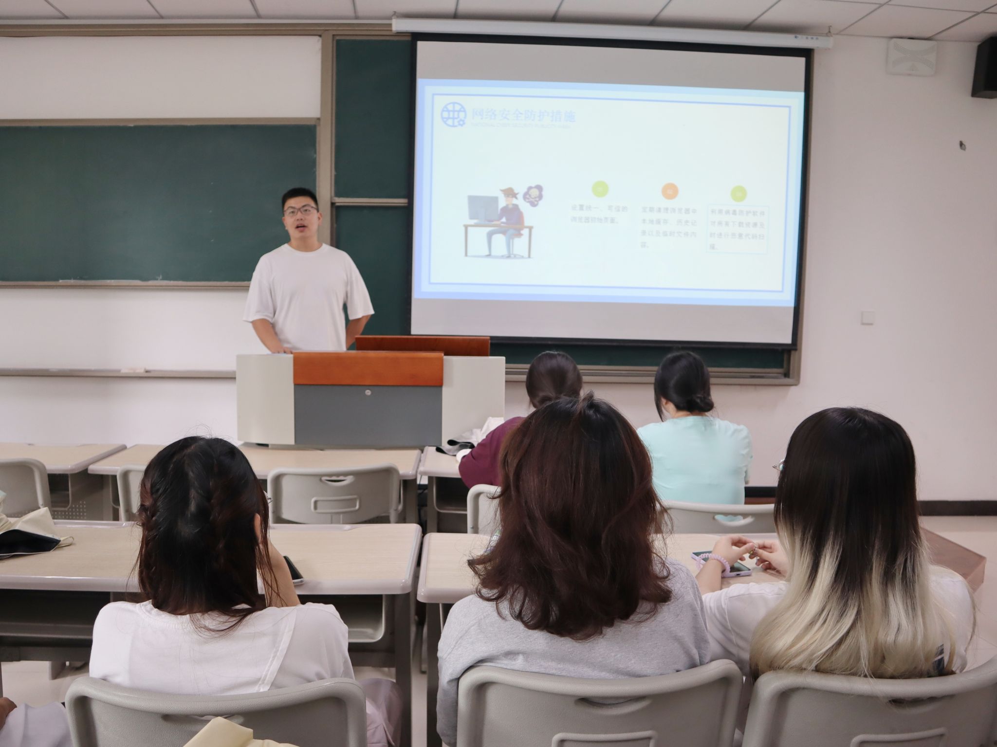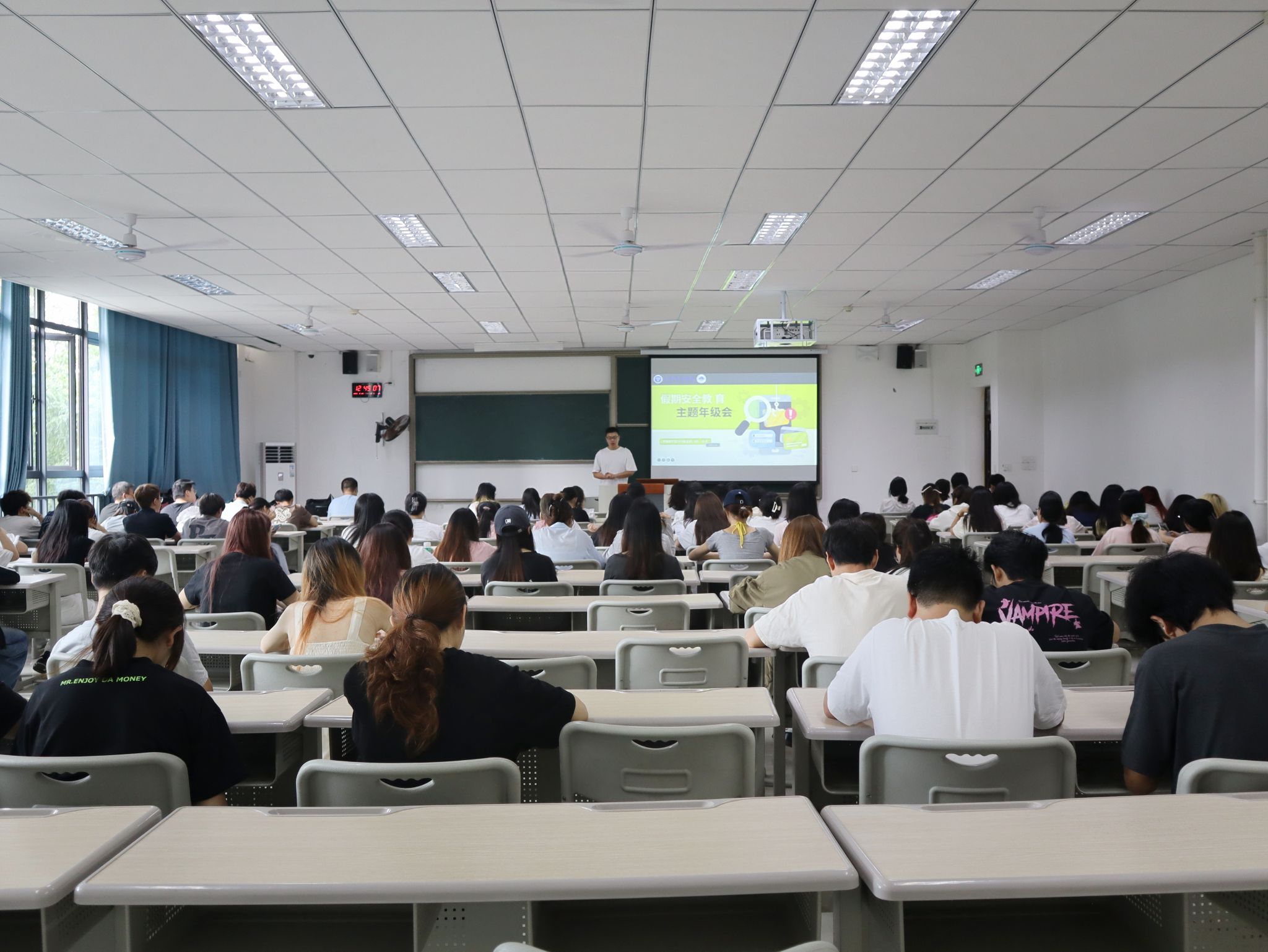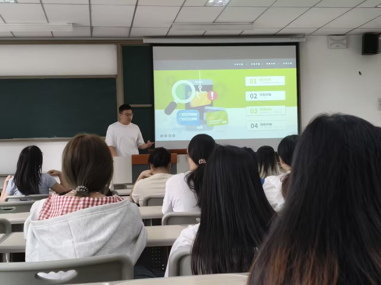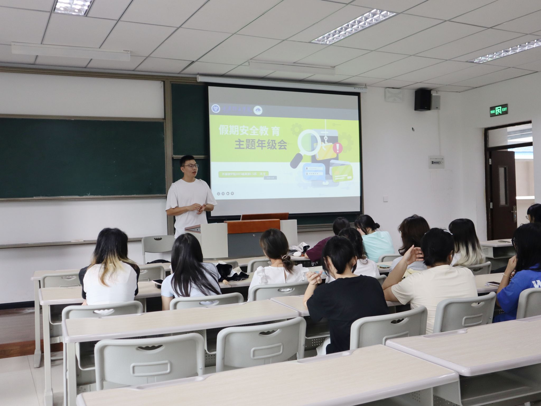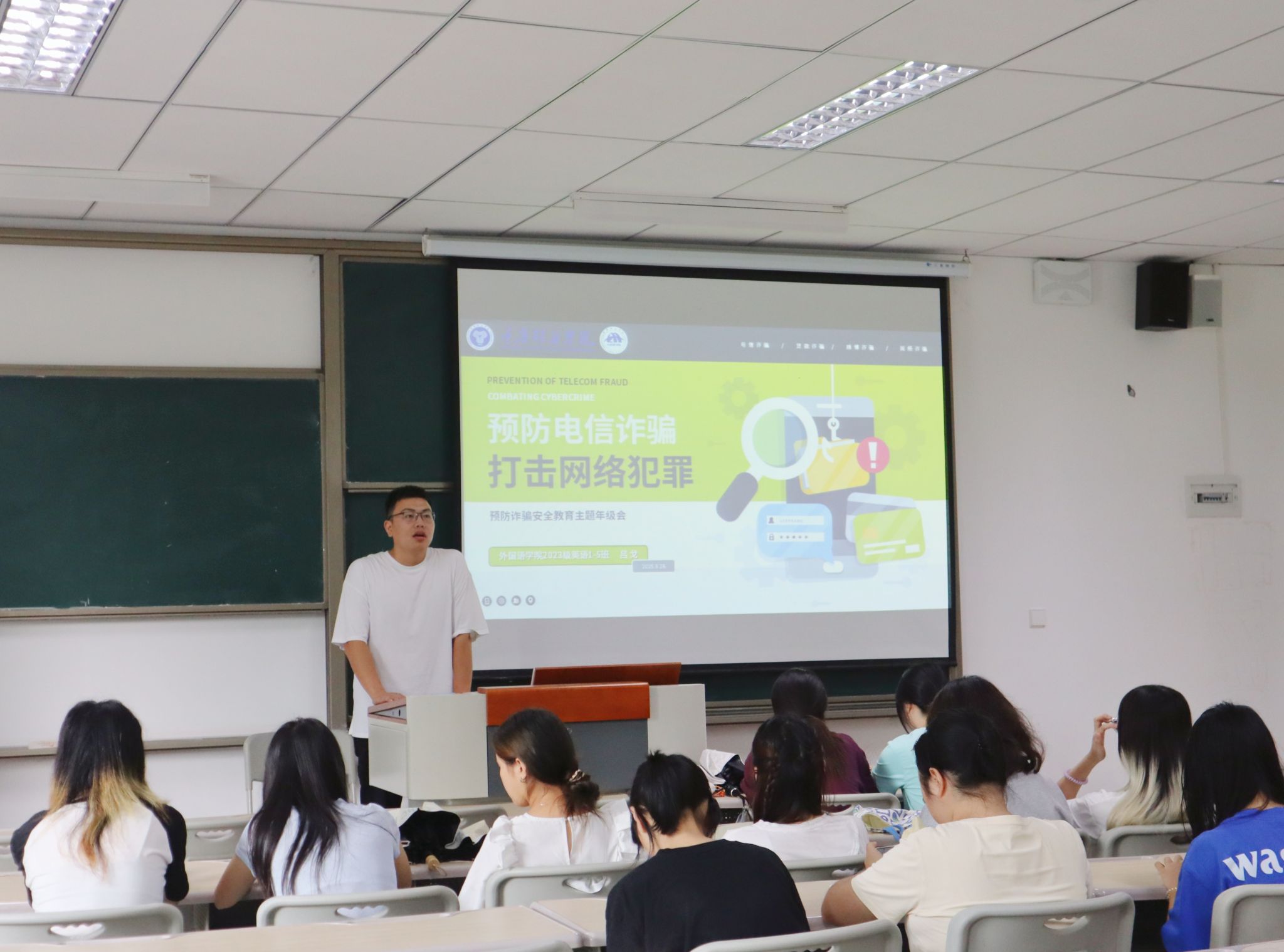 随着议题转入校园安全维稳大局,吕戈老师结合开学以来校内外发生的多起真实案例,展开了深入讲解。内容覆盖电信诈骗的常见手段与防范要点、网络安全与规范用网的严肃性、宿舍违规用电的巨大隐患,以及人际交往与情感健康的重要性。一桩桩发生在身边的案例,为同学们敲响了警钟。会议最后,吕戈老师就国庆假期出行安全与每日晚点名制度作了重点强调,并介绍了出国交流选拔的相关信息,提醒同学们在专注学业的同时,也要放眼世界,规划未来。