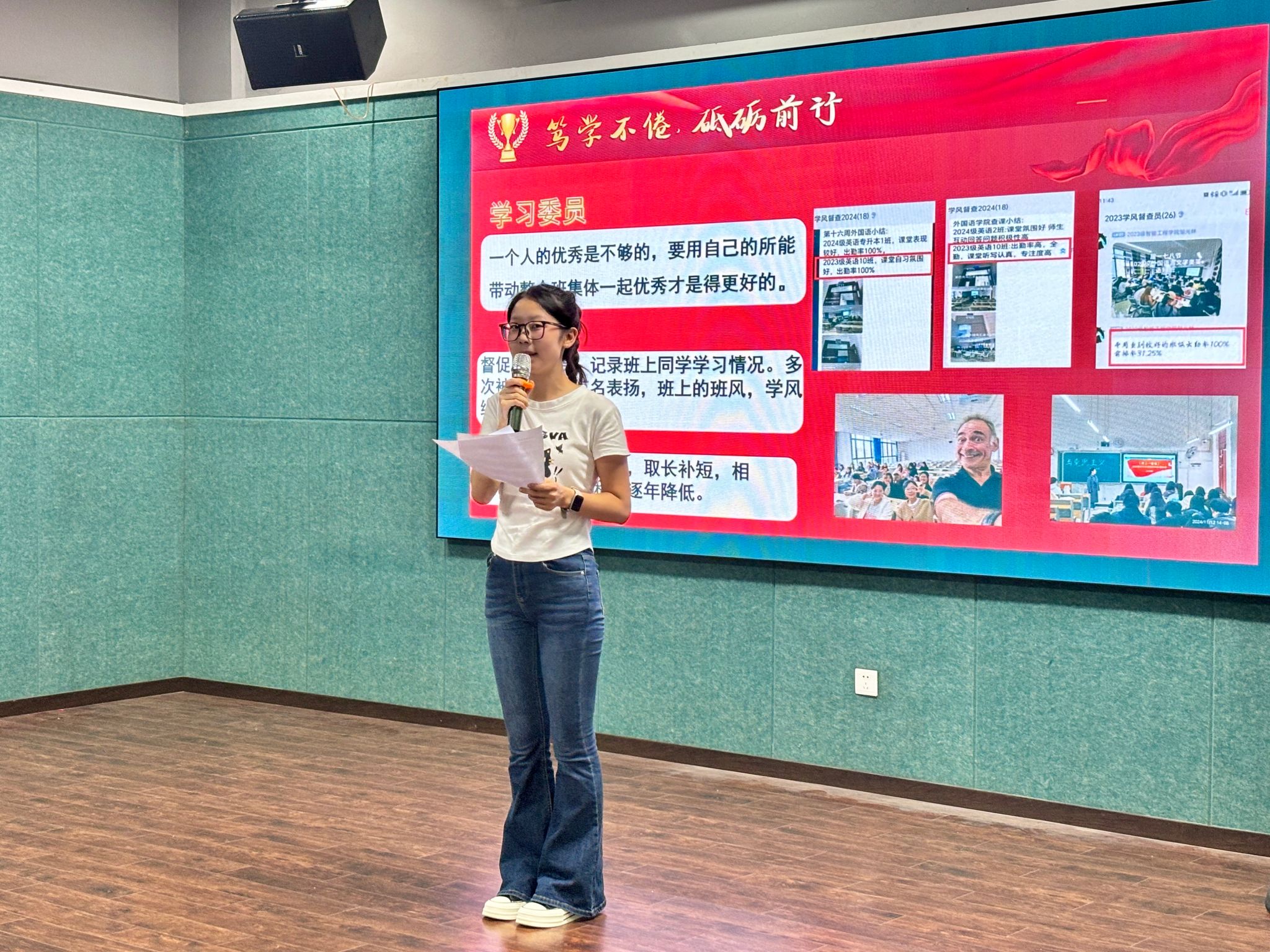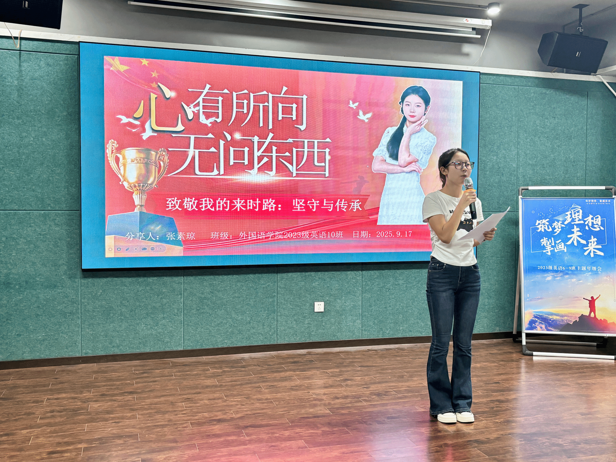 紧接着,活动进入了“榜样引领,青春无悔”环节。来自2023级英语10班的张素琼同学,作为国旗护卫队的代表,上台分享了她用青春守护国旗的热血故事。张同学以实际行动诠释了信念的力量——“台上一分钟,台下十年功”。她的讲述,让同学们看到了在平凡岗位上也能绽放出不平凡的光彩,激励着大家在自己的职业道路上坚定信念,勇往直前。