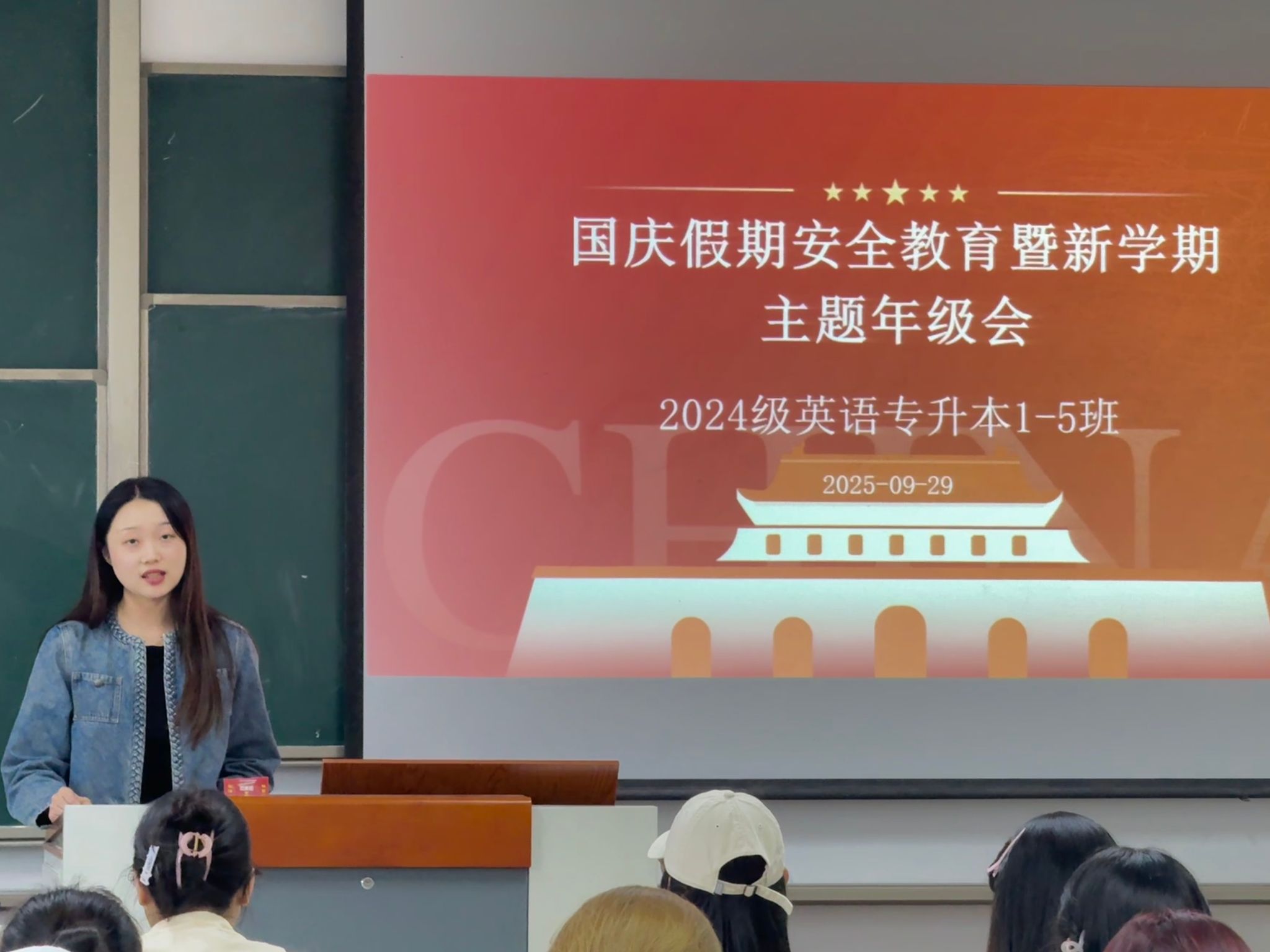 筑牢安全防线,启航青春梦想。在国庆佳节与新学期交汇的关键节点,外国语学院2024级专升本1-5班于9月29日隆重召开主题年级会,辅导员杨雨菡老师围绕“成长”与“安全”两大核心,为全体学子奉上一场深刻而温暖的青春导航,旨在引导外院学子胸怀“国之大者”,将个人理想融入时代洪流,鼓励大家在青春奋斗的沃土中,在跨境电商业态浪潮里,书写外语人的报国新篇,实现从“校园人”到“社会人”的价值升华。