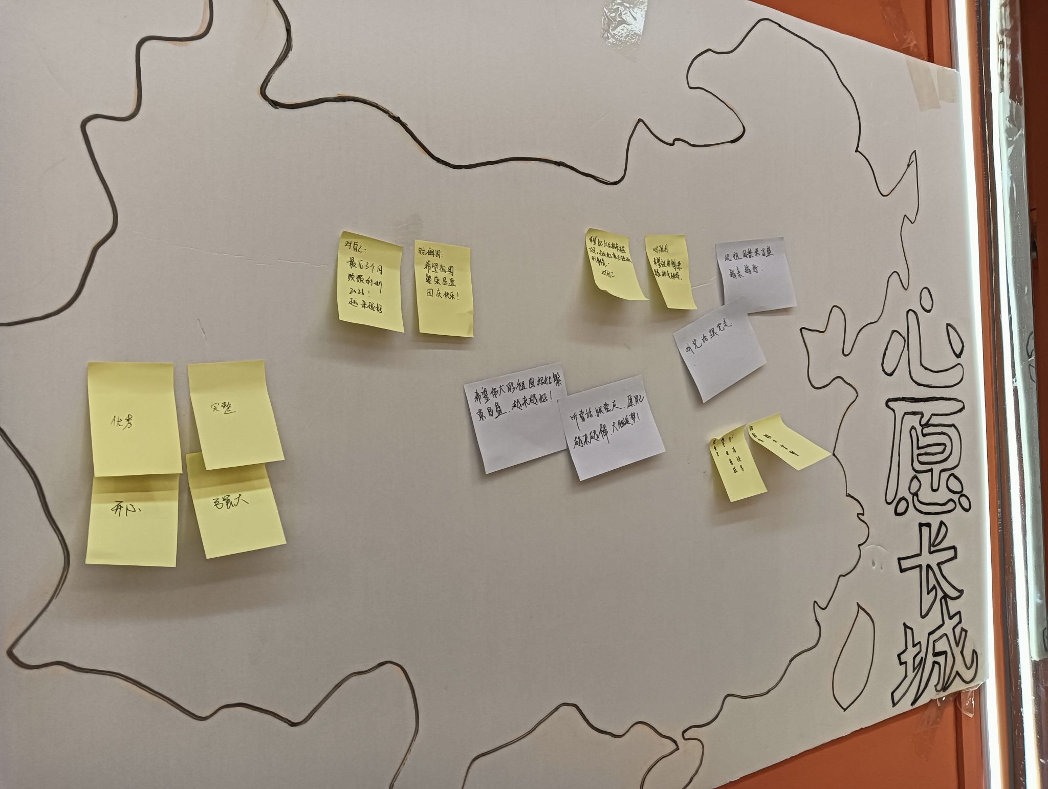 活动筹备阶段,此次活动以"联结自我,温暖前行"为核心立意,系统构建活动框架。流程设计上,遵循"认知-体验-升华"的递进逻辑,设置破冰交流、游戏互动、心愿传递三大环节,形成完整的情感联结链条。物资配备方面,严格按功能分区标准配置便签纸、长城轮廓展板及游戏道具。同时,对志愿者开展标准化培训,涵盖引导话术规范、氛围调控技巧及应急预案处置,确保通过专业化服务流程,为同学们营造具有人文温度与情感深度的沉浸式体验。