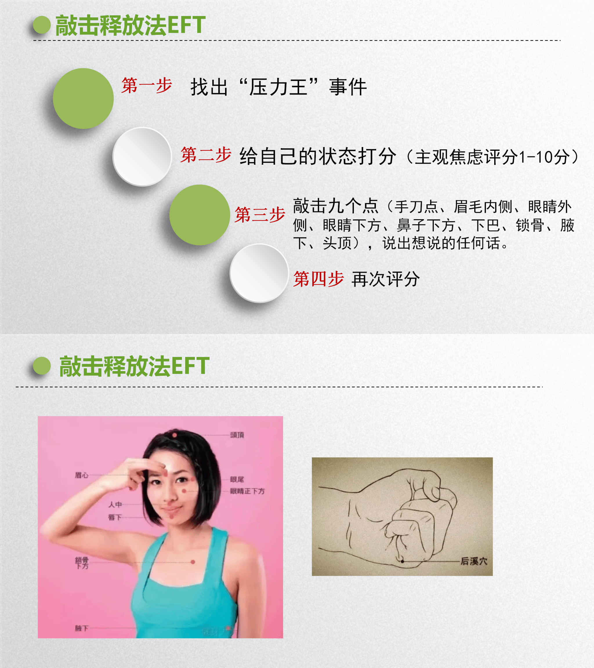 EFT敲击释放法:通过结合“压力王”敲击九个点位(手刀点、眉毛内侧、眼睛外侧、眼睛下方、鼻子下方、下巴、锁骨、腋下、头顶)来释放情绪,可以有效改善不良情绪。