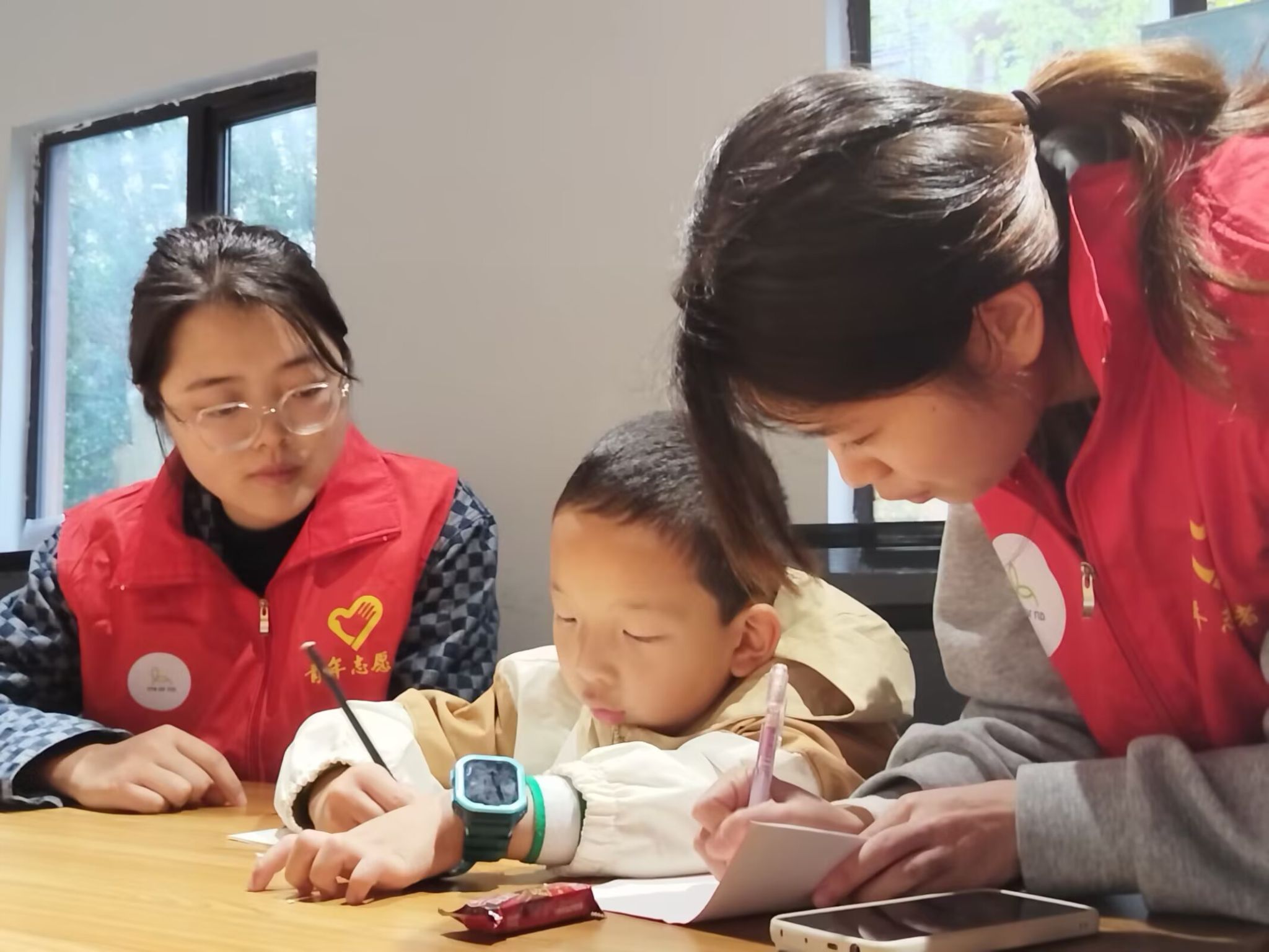 活动过程中,志愿者们主动坐在小朋友身旁,耐心为孩子们讲解知识难点与游戏规则。这一暖心举动不仅有效拉近孩子们与课堂的距离,更彰显出志愿者们对志愿服务的热忱与坚守,让整场活动充满温情与教育意义。即便当日细雨绵绵,空气中带着潮湿凉意,但志愿者与孩子们之间的真情犹如火炬,驱散走寒意,传递着温暖。志愿者们弯腰俯身、轻声细语的教导姿态,与孩子们的纯真笑容相映成趣。在一声声稚嫩的“谢谢”中,志愿者们不仅对教育本质的认知有所改变,深刻体会到被孩子们需要的价值感,更在与孩子的互动中磨砺耐心,提升应对突发状况的应变能力。