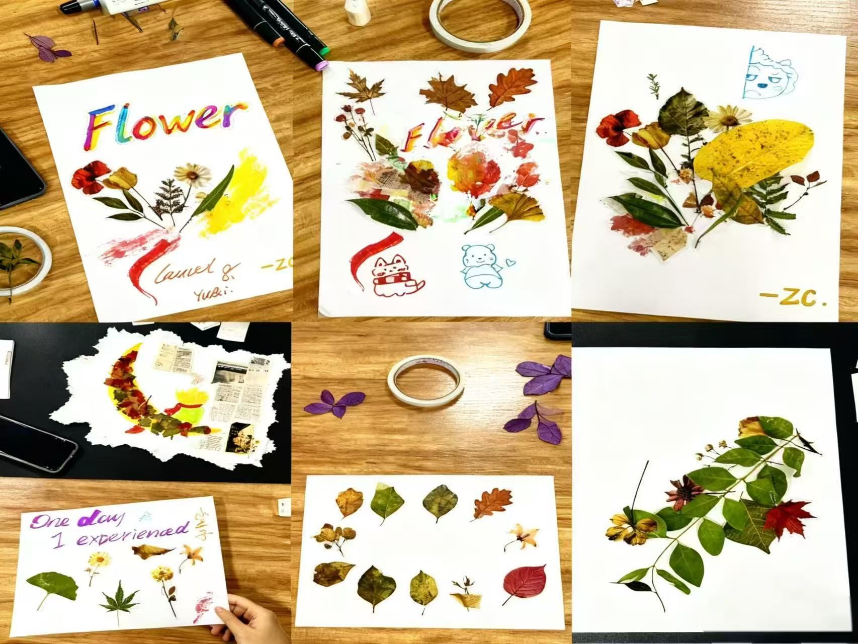 在“叶语心画”植物贴画创作环节,同学们以小组为单位,利用落叶、花瓣等自然素材进行贴画创作。各组成员借助植物形态与色彩,隐喻表达内心情绪。一片枯叶可以象征疲惫,一朵绽放的花则代表希望。该过程不仅激发学生创造力,更在无声中完成情绪的外化与分享,增强彼此理解。