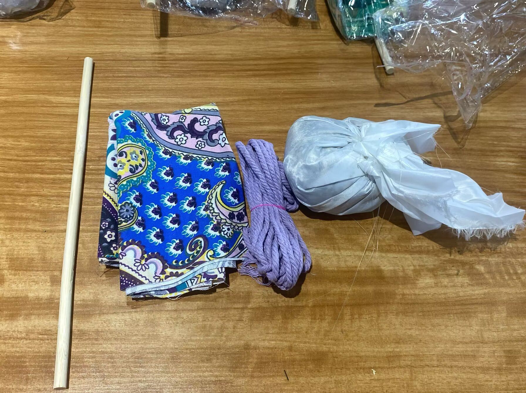 理论铺垫后,手工制作环节正式开启。班委们将预先裁剪好的花色布料、晒干的陈艾绒、便捷缝制工具逐一分发,并全程示范“无针线式”艾草锤制作:从布料对折固定的技巧,到艾绒填充的松紧把控,简单易操作的步骤让团员们快速上手。