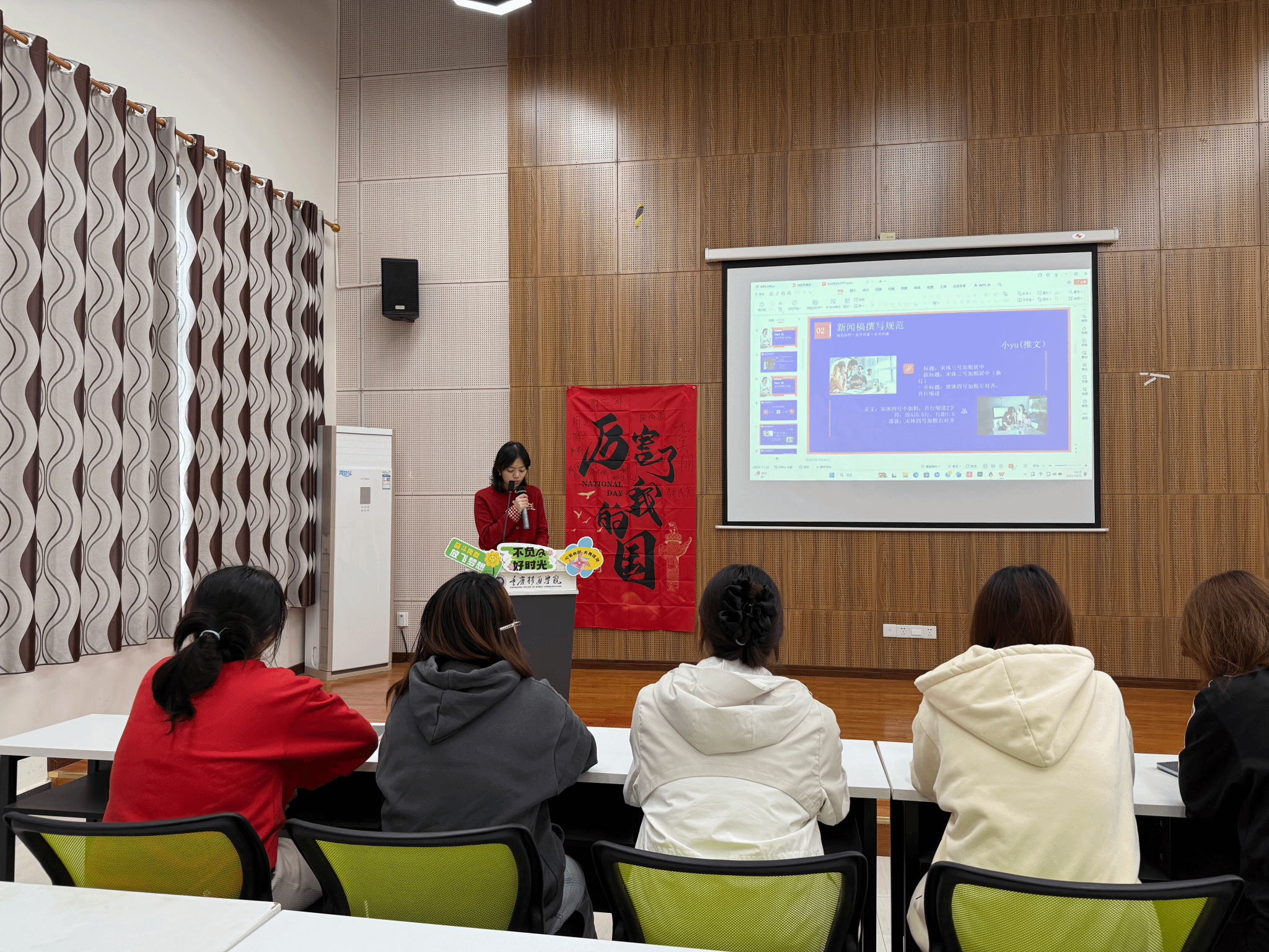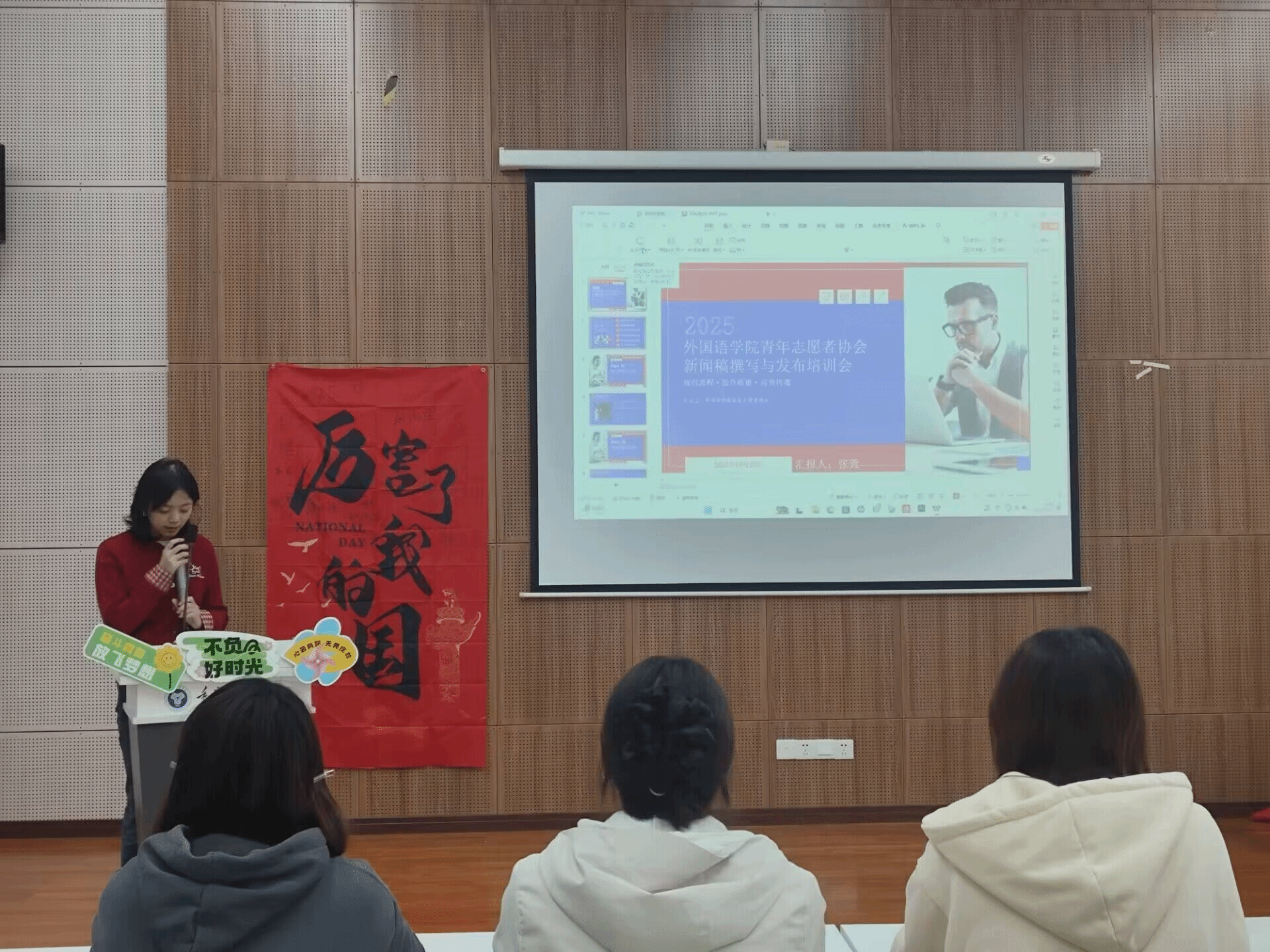 在金秋送爽、丹桂飘香的时节,为全面提升重庆移通学院外国语学院青年志愿者协会全体干部干事的新闻稿撰写能力与专业宣传素养,进一步夯实工作技能,外国语学院青年志愿者协会于2025年10月22日下午两点,在天渠书院111报告厅隆重举办花果培训系列活动之新闻稿格式专题培训。本次活动旨在通过系统性的讲解、互动式的研讨与针对性的指导,为全体青协成员“充电赋能”,助力其更快、更好地适应新时代背景下宣传工作的要求,掌握传播规律,讲好青协故事。