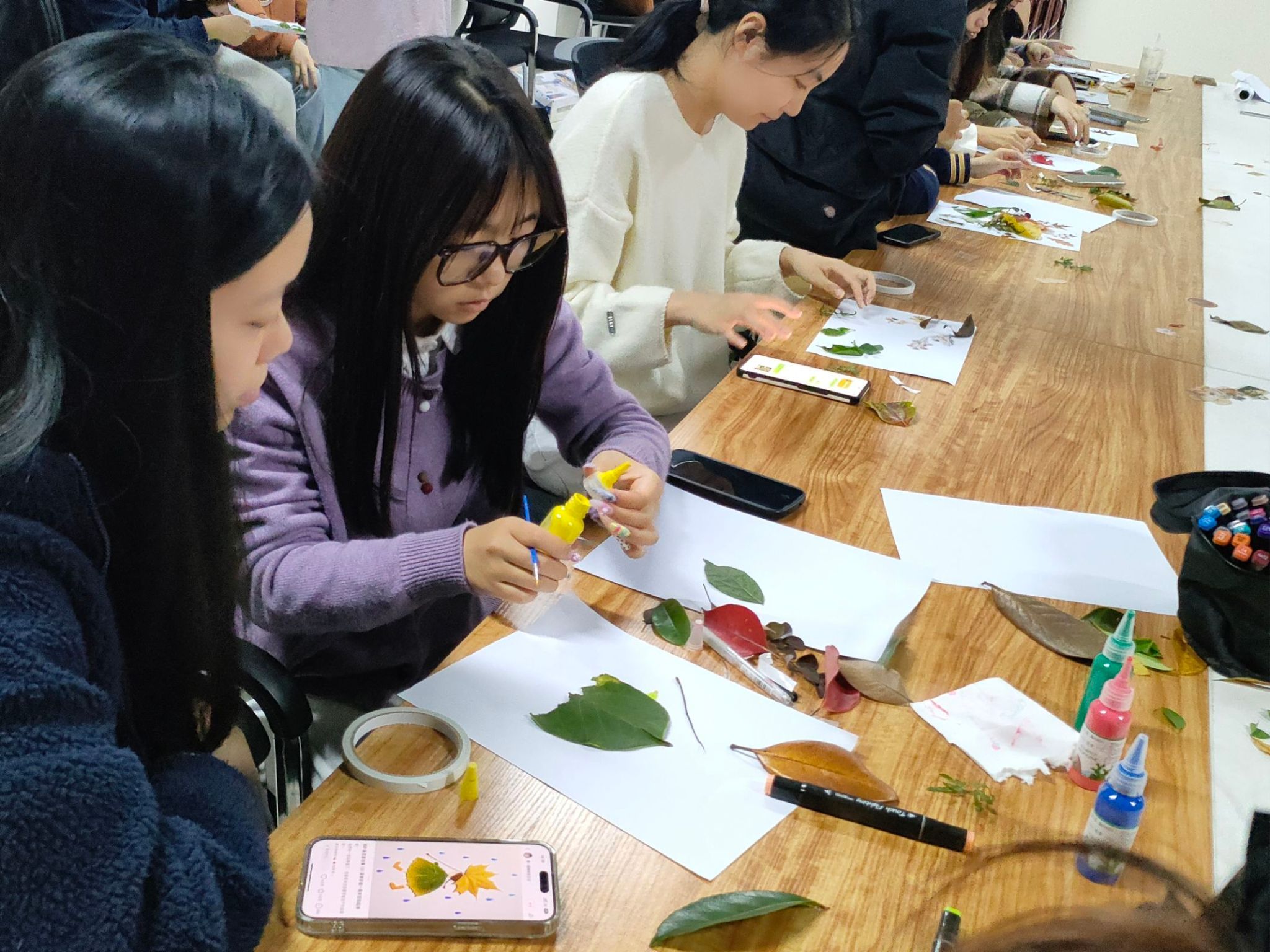 第一环节以“分组协作”为核心形式,活动伊始,各小组便带着收集袋走进校园角落——有的蹲在银杏道捡拾扇形黄叶,有的在花坛边轻采浅粉花瓣,你找“形状特别的”,我挑“颜色鲜明的”,分工合作间满是热闹。收集完毕后,创作正式开启。桌面上,画纸、彩笔与草木素材整齐摆放,同学们先以彩笔勾勒轮廓,有人画奔跑的人物,有人绘栖鸟的枝头,皆贴合“人物与自然融合”的参考风格;再拿起素材巧妙粘贴,用红色枫叶点缀“小人”的裙摆,隐喻热烈的喜悦;用层层叠叠的绿叶铺就“小径”,传递内心的平静,本次活动让同学们亲近校园自然、进行动手创作,借由树叶、花瓣的多样形态隐喻表达内心情绪,同时在分组收集、共同创作的互动里,切实提高团队协作能力,营造具有人文温度与情感深度的沉浸式体验。