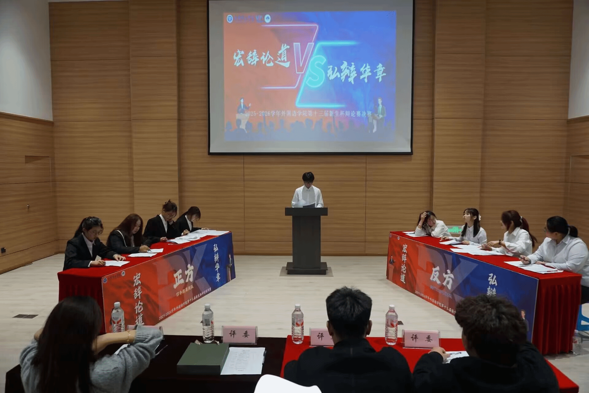 为全面践行学校特色鲜明的完满教育理念,进一步提升新生的语言组织、逻辑思辨与临场应变能力,2025年10月24日14:00,“宏辞论道,弘辩华章”——外国语学院第十三届“新生杯”辩论赛决赛在六度空间创梦空间正式打响。本次比赛特邀徐明飞、阳果、刘佳昕三位老师及校辩论队队长张捷宇同学担任评委,共同见证新生辩手的思想交锋。