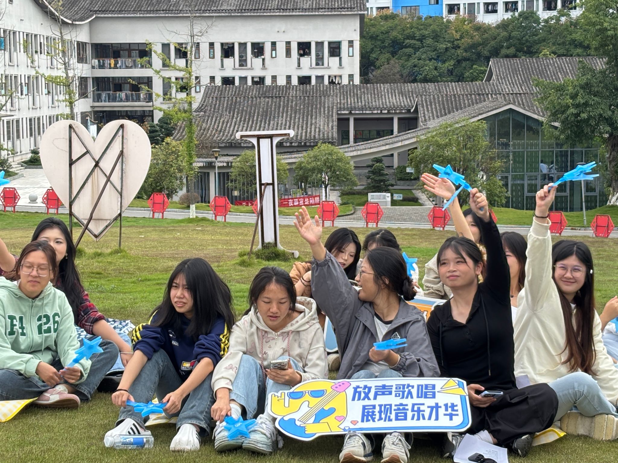 活动伊始,班级精心策划的音乐猜谜环节便迅速点燃全场氛围,成功勾起全体师生的参与兴趣。随后,班级推选的4个优秀节目依次登台,凭借精彩绝伦的表演赢得全场瞩目。其中,黄庆林与张梓瑶同学组成的临时组合,带来活力四射的歌曲《我的未来式》,轻快的旋律搭配流利动听的演唱,充分展现了外语学院学子出众的语言素养与卓越的音乐天赋;张敏同学倾情演绎的《奇迹再现》,温柔的歌声里满溢着青春气息,每一段旋律都承载着童年的璀璨光芒;此外,陈美玲同学带来的朗诵《闪闪的红星指引着我》,将红色旋律与生动的肢体语言完美融合,极具感染力的呈现赢得台下阵阵热烈掌声与欢呼;最后,杨紫熠和曾焱同学携手演唱的《稻香》,用熟悉的旋律带领大家重温家的温暖,更让在场师生深刻感受到家永远是心灵的港湾。演出过程中,外语学院的学子们手持印有“多语种青春”“音绘世界”等字样的荧光牌,在夜色下熠熠生辉,成为草坪上一道格外亮眼的风景线。