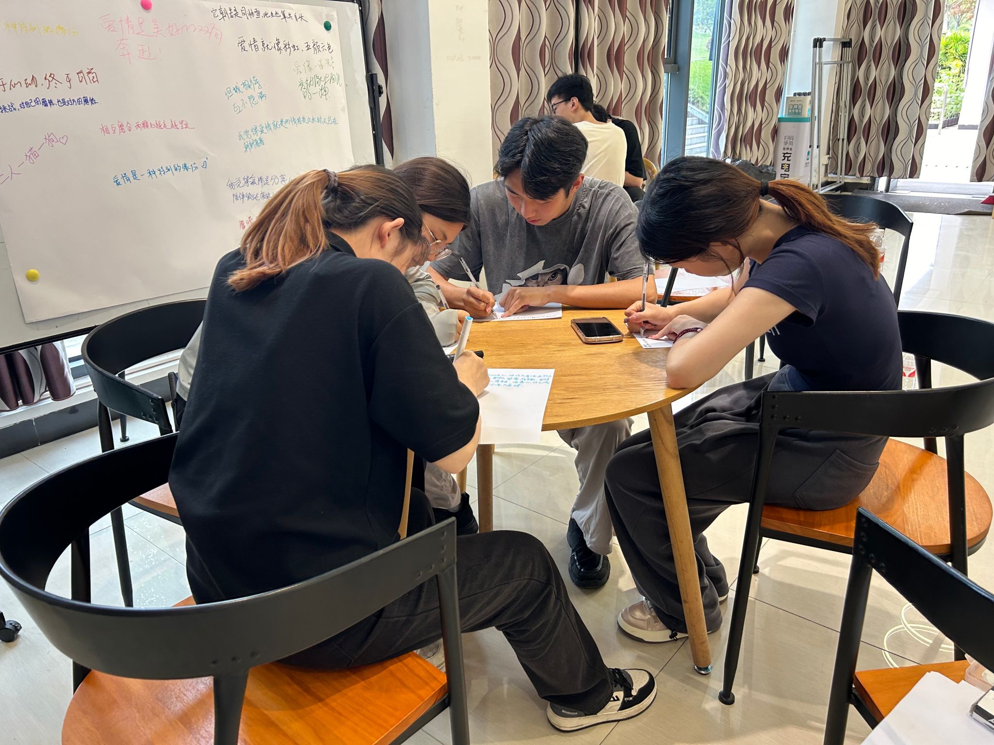 第二环节,段玉老师和付海鸿老师引导同学们进行了歌词创作。通过对前面分享环节的总结与提炼,帮助同学们捕捉那些能够触动人心的元素,为歌词创作打下基础。段玉老师和付海鸿老师鼓励学生们自由发挥想象,同时教授歌词写作的基本技巧,例如如何构建歌曲的结构,使歌词既有文学美感又易于谱曲演唱。