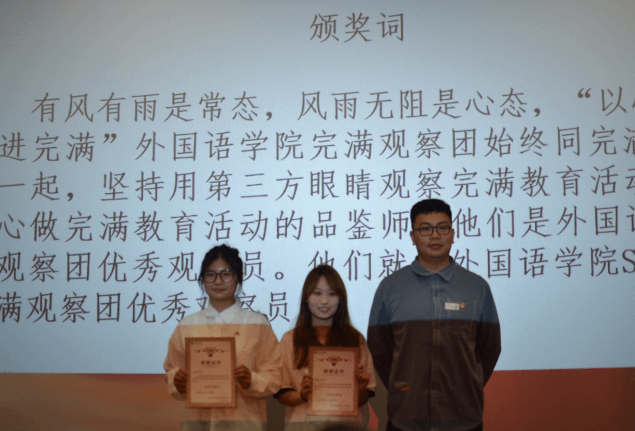 随后,大会宣读外国语学院第五期青马工程初阶班表彰名单,并为优秀学员颁发荣誉证书。这些学员在青马工程中表现优异,展现出色的领导才能和服务精神。紧随其后,外国语学院Starlight完满观察团的优秀观察员也接受表彰,他们的工作为学院活动的顺利开展提供重要支持。