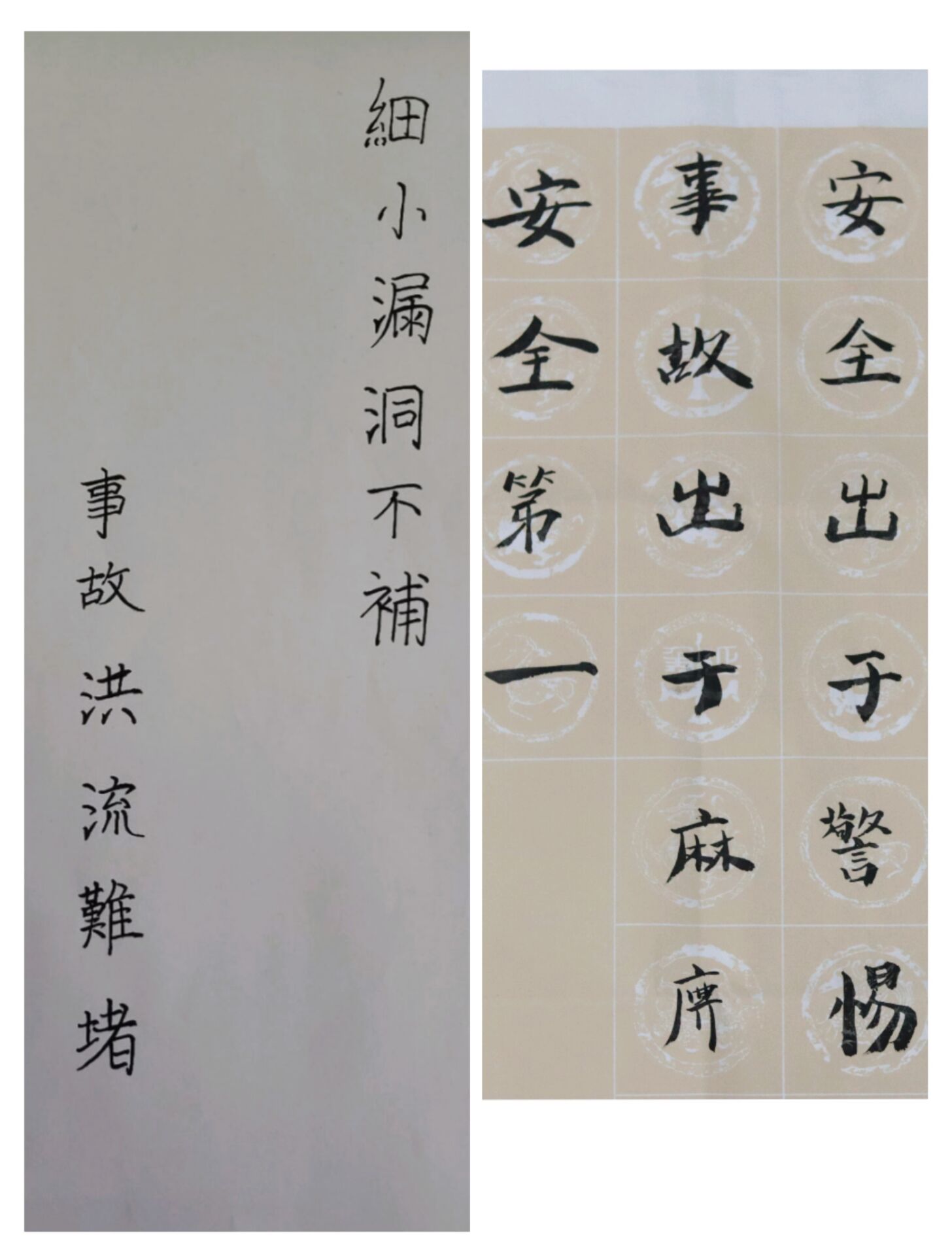同学们的宣传标语书法令我们眼前一亮。书法设计独出心裁,风格各异,在欣赏书法的同时也让我们注意到其内容。衡水体、隶书、楷书以及其他同学们自己设计的书法形式令我们心生赞叹。“事故出于麻痹,安全来于警惕”是同学们笔下的警示,“安全连着你我他,平安幸福靠大家”是大家对安全的美好期望。这些宣传标语无一不是在传播安全防范理念。