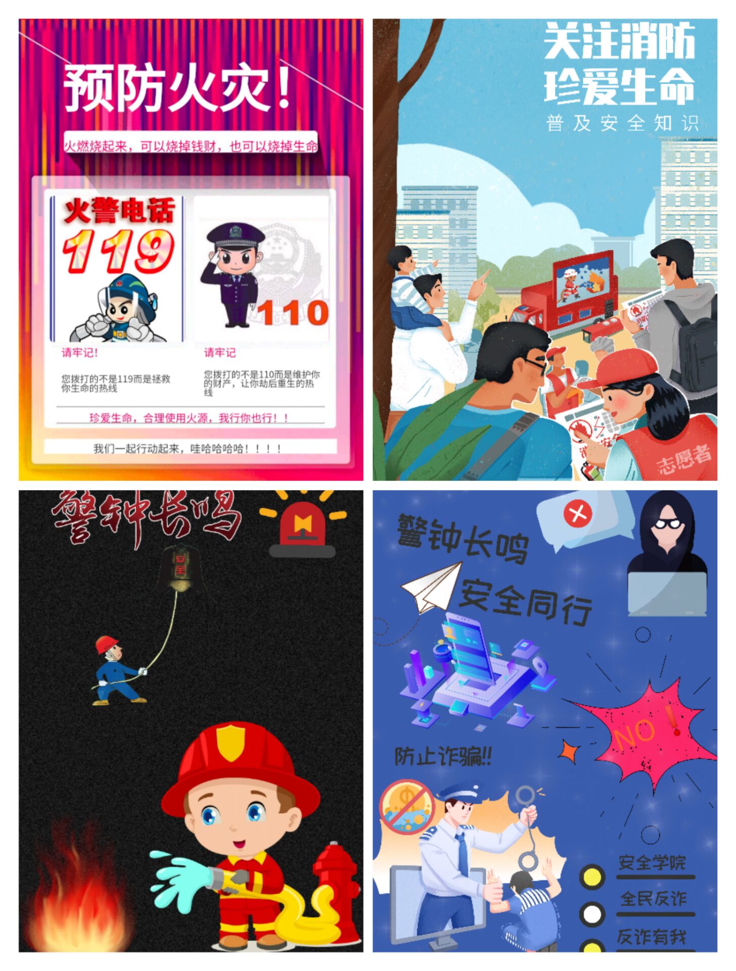海报设计独具匠心,别具一格,同学们用自己的创意设计海报,色彩鲜明,主题明确,每幅海报紧扣安全防范这一主题,同学们以动漫人物为主角,为海报增添一抹趣味。以熊熊燃烧的烈火为主要背景,在此基础上同学们添加一些小细节以此增加画面设计性,展现预防火灾的重要。同时同学们以连环画形式向我们生动形象的展示了诈骗过程及结果,警示大家注意防范诈骗。而关于安全用电同学们则用可爱的小孩子为主要元素,来提醒大家注意安全用电。这一系列画作都提醒了我们应当注意安全防范。