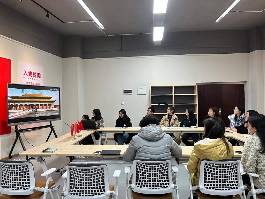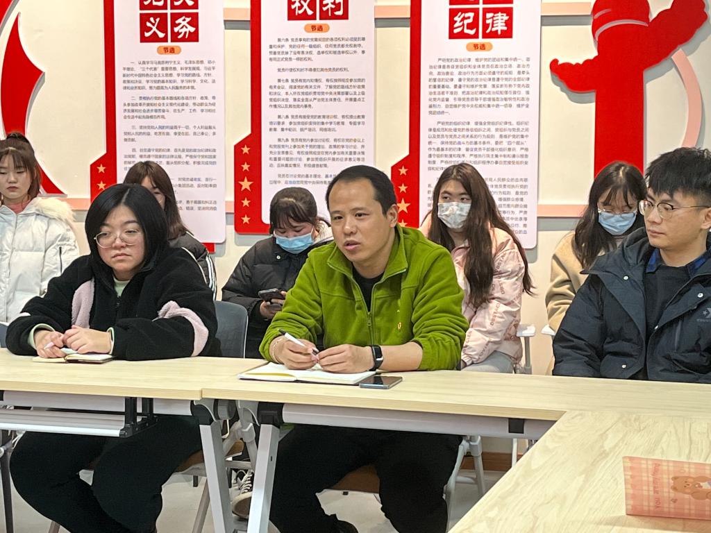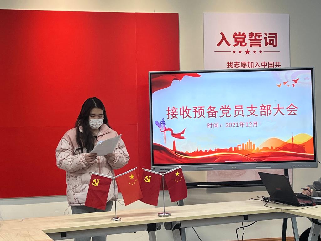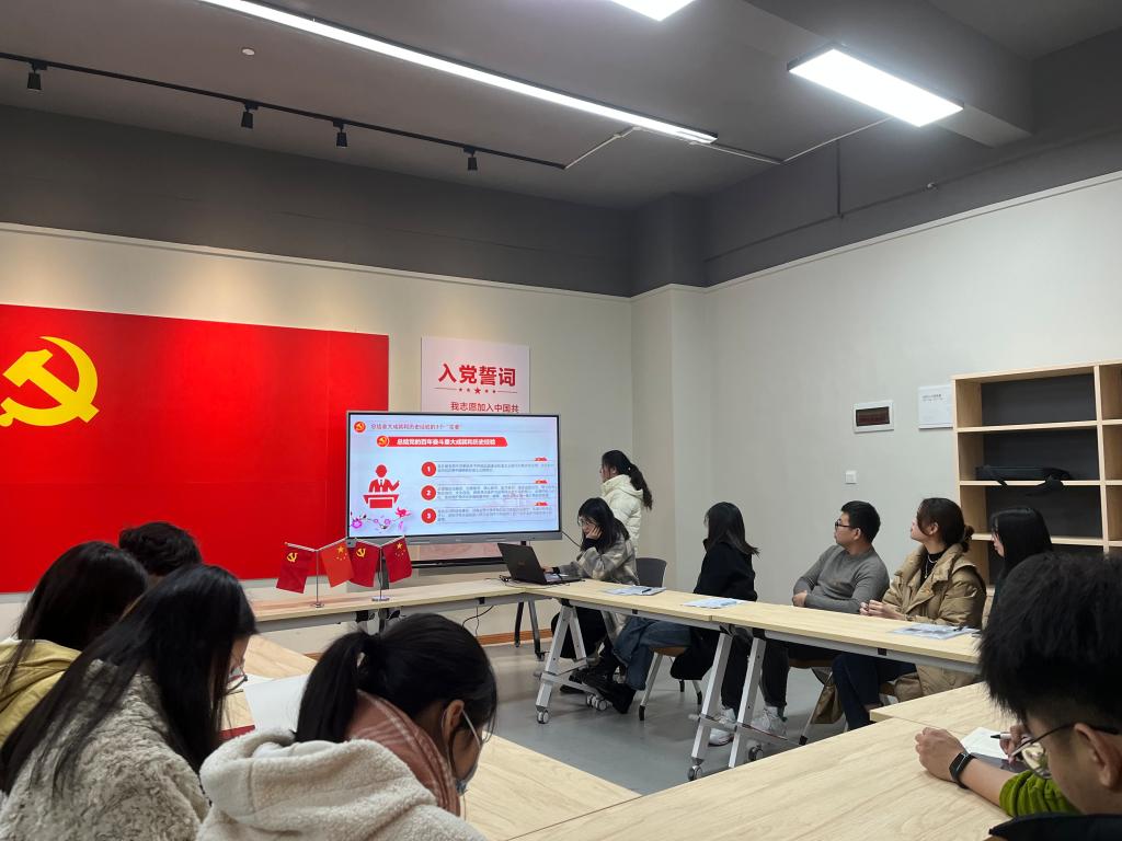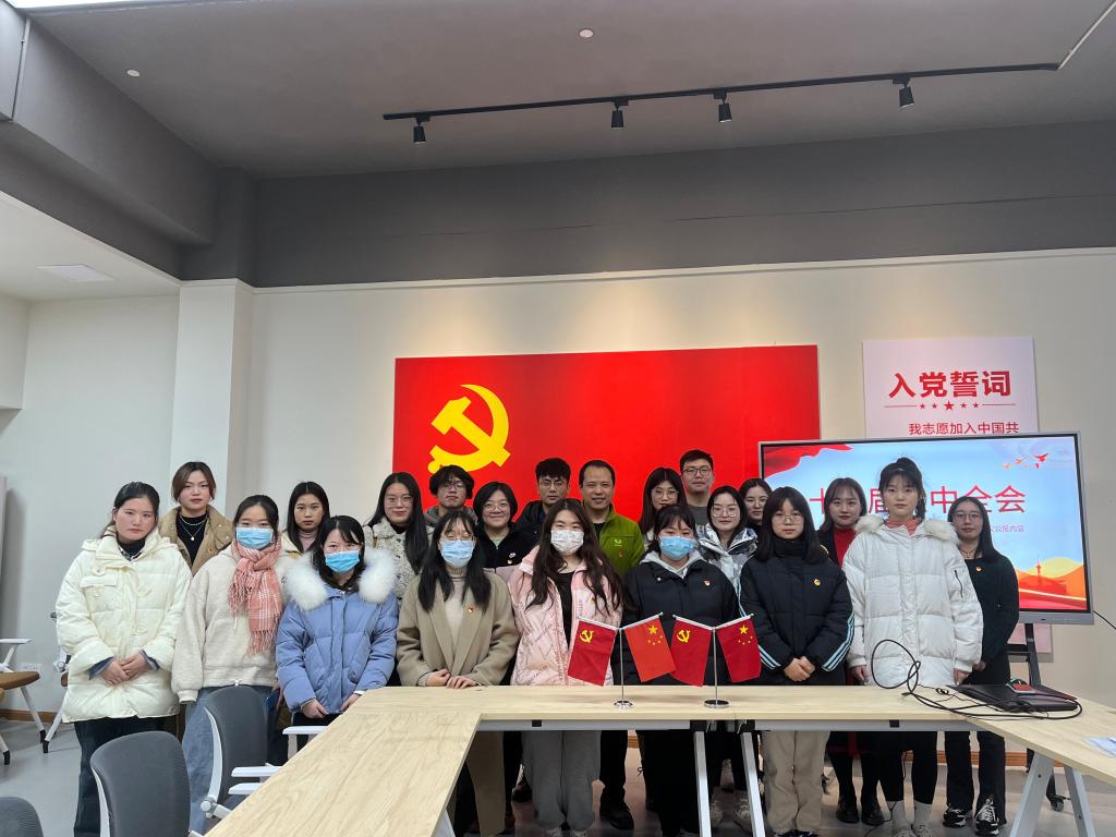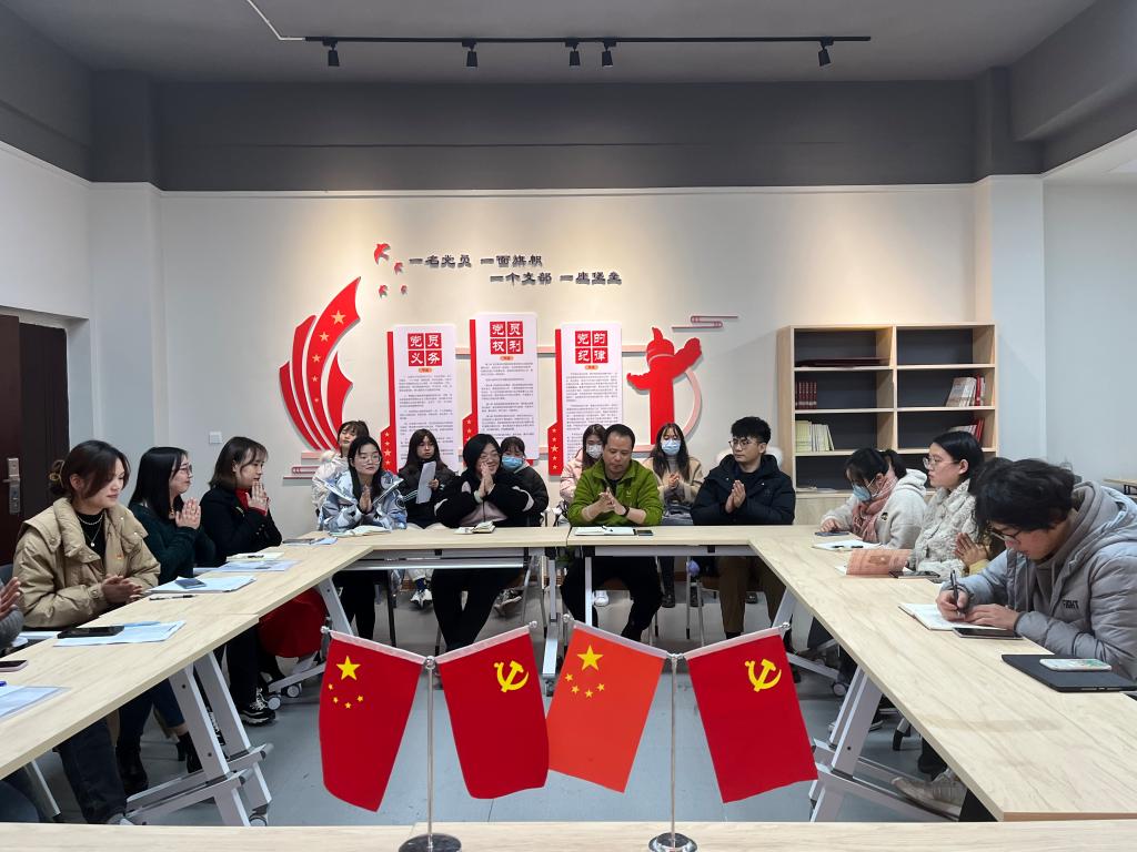 为巩固加深对党的十九届六中全会精神的学习,提升全体党员素质,2021年12月9日下午16:30,外国语学院学生党支部在南湖书院党团活动室召开了“青春向党,百年风华”支部主题党日活动暨接收预备党员大会,大会由屠建丽同志主持,外国语学院学生党支部教师党员、部分在校学生党员参与本次会议。