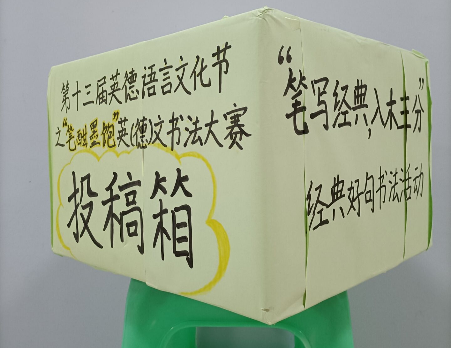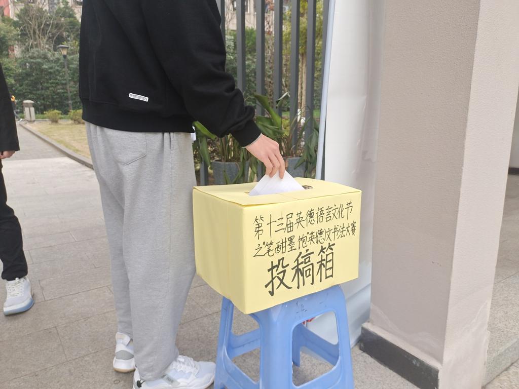 在本次活动中,参与选手可选取举办方提供的精美英文或德文段落进行书写誊抄。本次活动所选的文段均来自于大咖阅读名人传里的内容,目的是提高同学们阅读名著书籍的动力,使同学们充分感受大咖传记阅读的氛围。待投稿时间结束,工作人员收取所有作品,最终评选出优秀的书法作品。本次活动,合川校区共设立了四处线下投稿箱,分别放置于天渠报告厅,图书馆门口,B食堂二楼和南湖书院。随着投稿截止日期越来越近,一张张来自移通学子的书法作品呈现在评委眼前……清晰整洁的衡水体,飘逸洒脱的花体,标志细长的意大利斜体……原本富盈着文学气息的名著篇章在同学们精心打磨下显得愈发活灵活现,真是笔下生花呀!