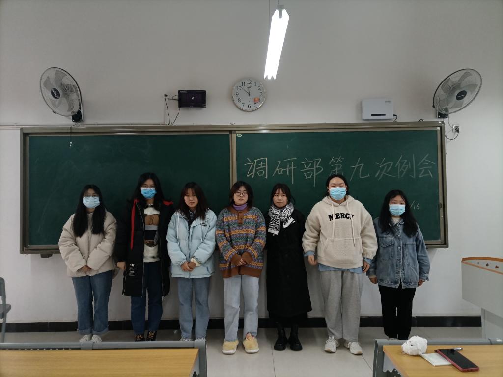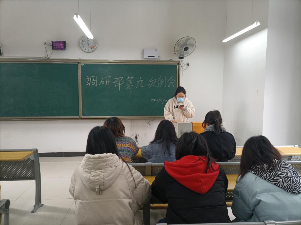 外国语学院调研部于2021年12月16日12:40在天渠104召开了第九次例会。例会中,邹巧部长指出了干事在撰写新闻稿和微信推文时存在的一些问题,并强调了格式的重要性。之后,邹巧、蒋琳灿两位部长对本次例会进行了一个简单小结,并对干事们寄予厚望。