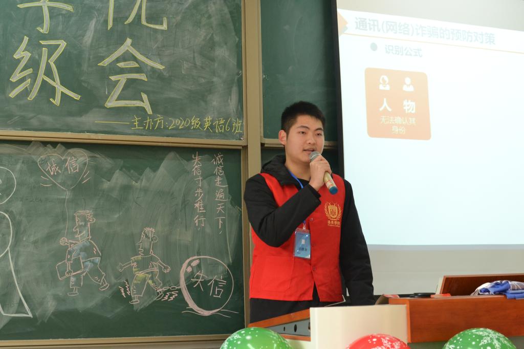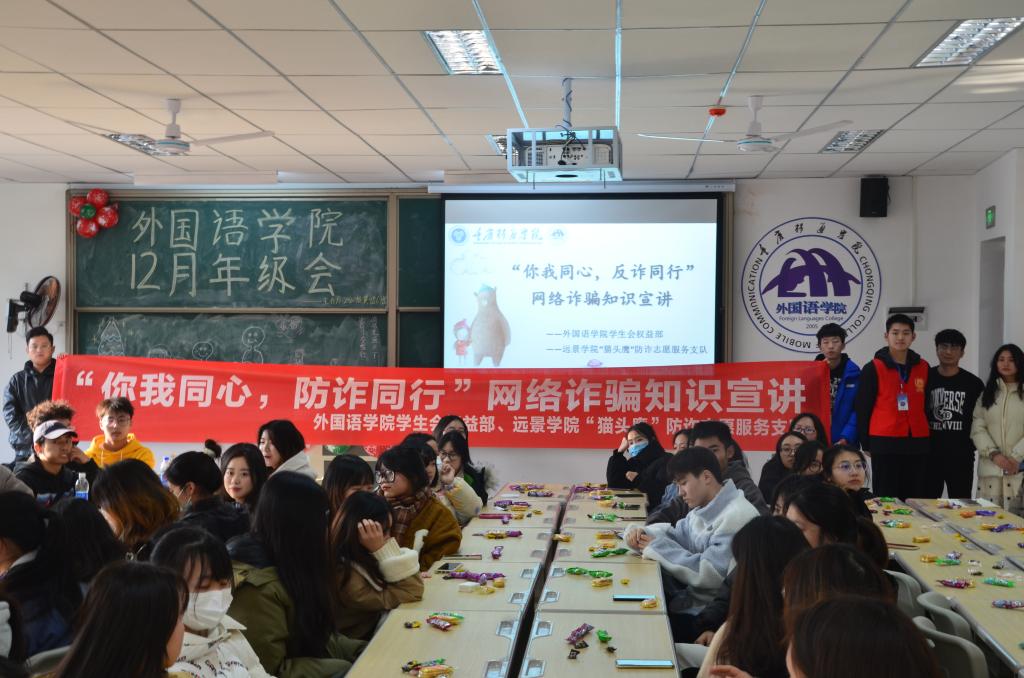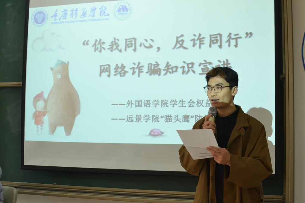 为加强同学们防诈意识,理性应对诈骗情况,保护自身利益。我校外国语学院权益部联动远景学院“猫头鹰”防诈志愿服务支队,邀请远景学院龚喜力学长为同学们讲解防诈骗知识及手段,于2021年12月22日下午3点30分在北校区第九教学楼9106展开以“你我同心,反诈同行”网络诈骗知识宣讲活动。