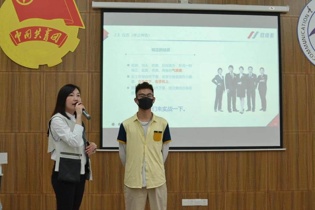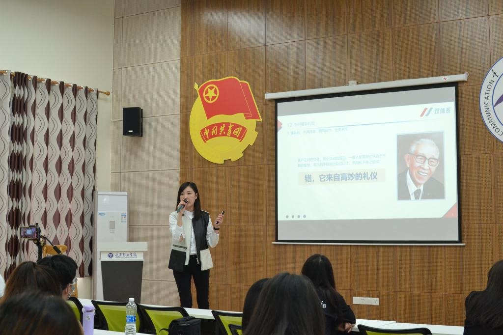 以礼待人是修养风度的体现,也是人格魅力的外在表露。为提升外国语学院学生的职场礼仪素养,了解到更多的礼仪知识。外国语学院团总支有幸邀请到就业创业指导中心高级创业导师陈星颖老师,于2022年4月8日14:00,在天渠111报告厅和外国语学院哔哩哔哩官方账号线上直播同步开展“精彩职场,美丽人生”外国语学院I·EQ计划情商训练营职场礼仪培训。