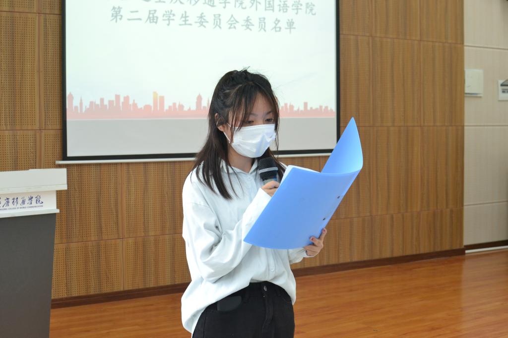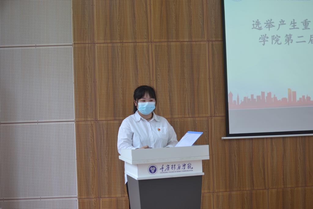会议第四项,宣布当选重庆移通学院外国语学院第二届学生委员会委员名单。经监票员、计票员点票,由总计票人宋慧中公布最终票数,肖朝南、涂馨尹、黄钊渝3名同学当选为重庆移通学院外国语学院第二届学生委员会委员。
