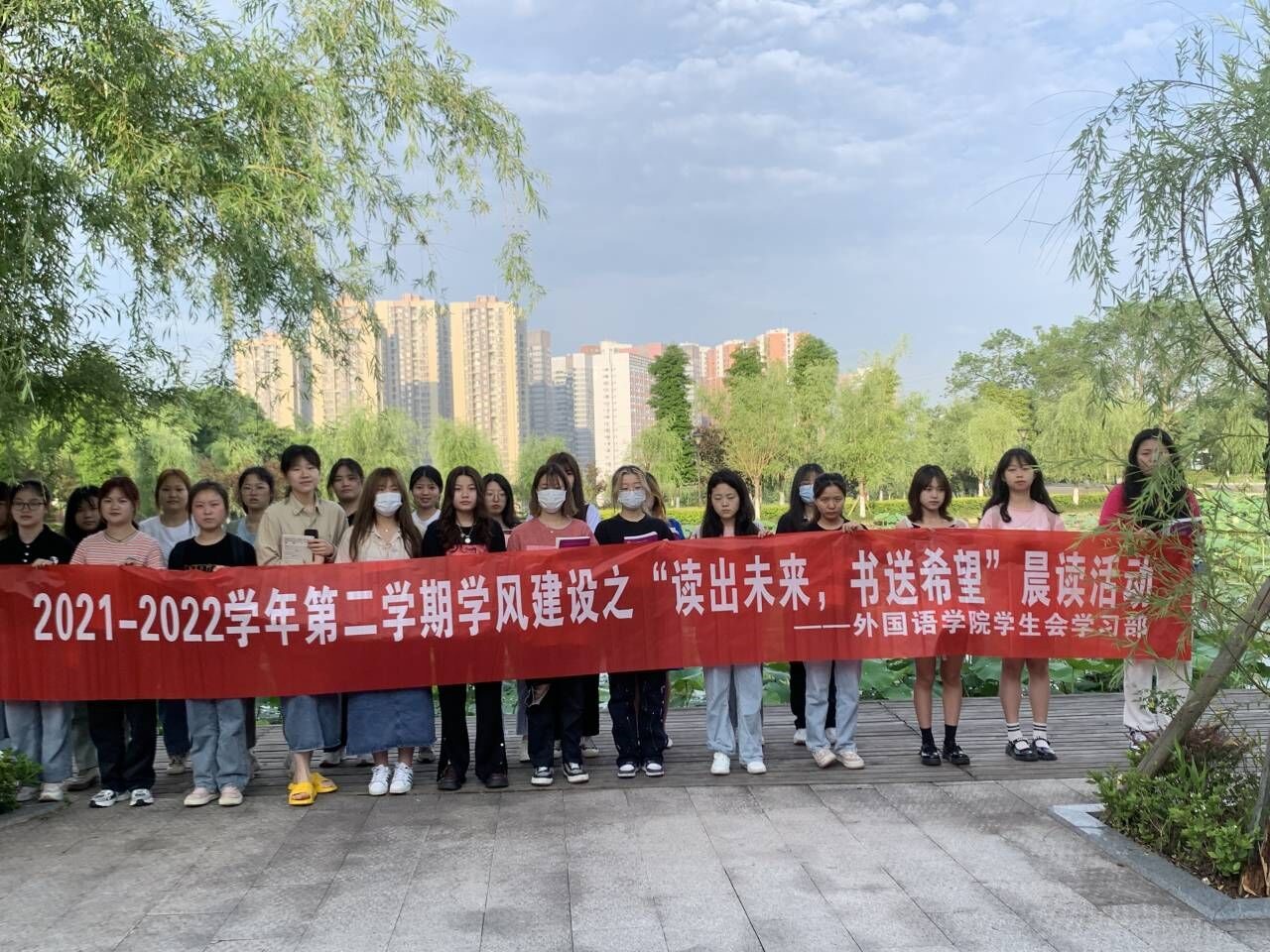 2022年5月10日到13日,伴着初生的第一缕阳光,2021级英语六班学生们来到天渠书院荷花池旁,进行了英语晨读活动。本活动意在增强阅读兴趣,提升学院学生的英语水平,使其充分利用早晨的时间,好好学习英语,从而加强学院的学风建设。优良的学风,不是一天就可以形成的,万事坚持难,相信在以后,蓝天下校园里每天早晨都会出现同学们的晨读身影,也有同学们的朗朗书声。胸怀鸿鹄志,晨起诵读书。本次晨读活形成的学习风气也将会带动更多积极向上的同学自律晨读。