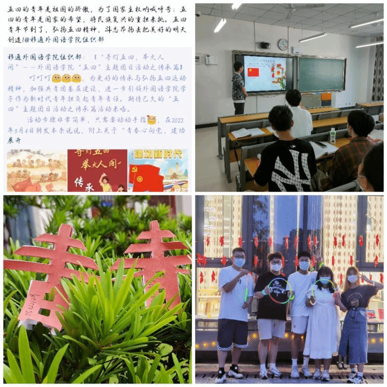 五四青年节如期而至,五四精神的风潮飞奔而来。当代青年应主动的传承和发扬伟大的五四精神,为更好的加强共青团基层建设,让同学们深入感受到五四精神的魅力,绽放青春的气息,展现同学们的青春风采。外国语学院团总支于5月1日—5月8日,通过线上加线下的形式举办的“寻灯五四,举火人间”五四青年节特别活动。通过“传承篇”,“芳华篇”,“研学篇”,“风采篇”四个篇章的内容,更加用多种方式传递五四的深刻内涵,形象生动的展现五四精神,让同学们度过一个精彩难忘的的五四青年节。