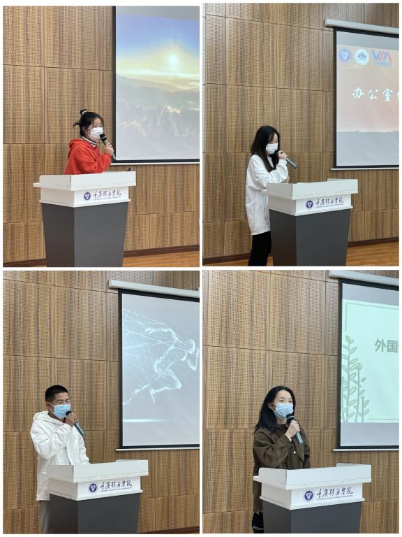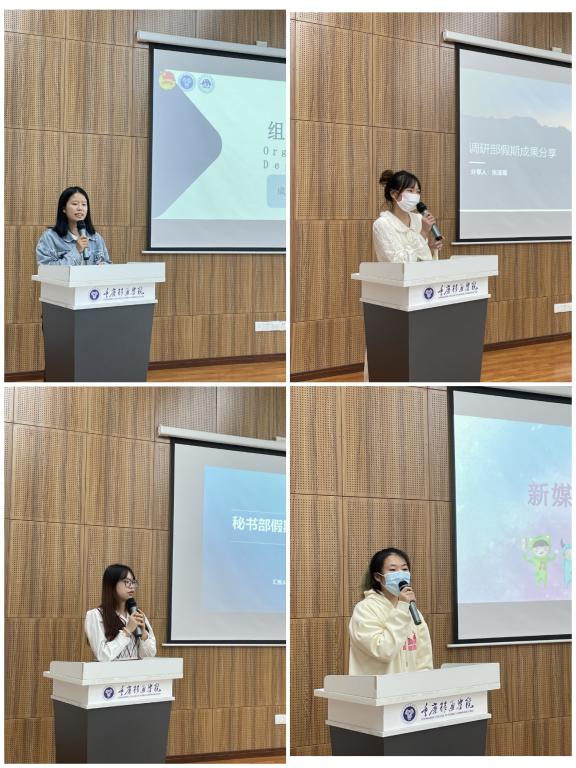 活动伊始,在主持人的带领下,外国语学院学生组织各部门代表依次上台进行假期成果展示。在各位代表分享的大咖阅读心得感悟与经典语段中,让大家对这些书的感触更加深刻,文字的力量是触及心灵的,或令人震撼、或令人深受启发、或令人感同身受,在部门代表中提到的《马云:未来以来》中,“见过世界上各种各样的人,听各种各样的观点,跟优秀的人交流以后,你看问题的视野和深度会很不一样”。不管未来有多远,现实的未来一直都在大家的周围,希望干部们能定位当下的自己,找准目标,以最好的姿态与态度去直面学习与生活困境。