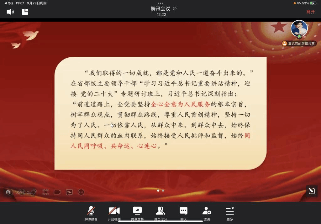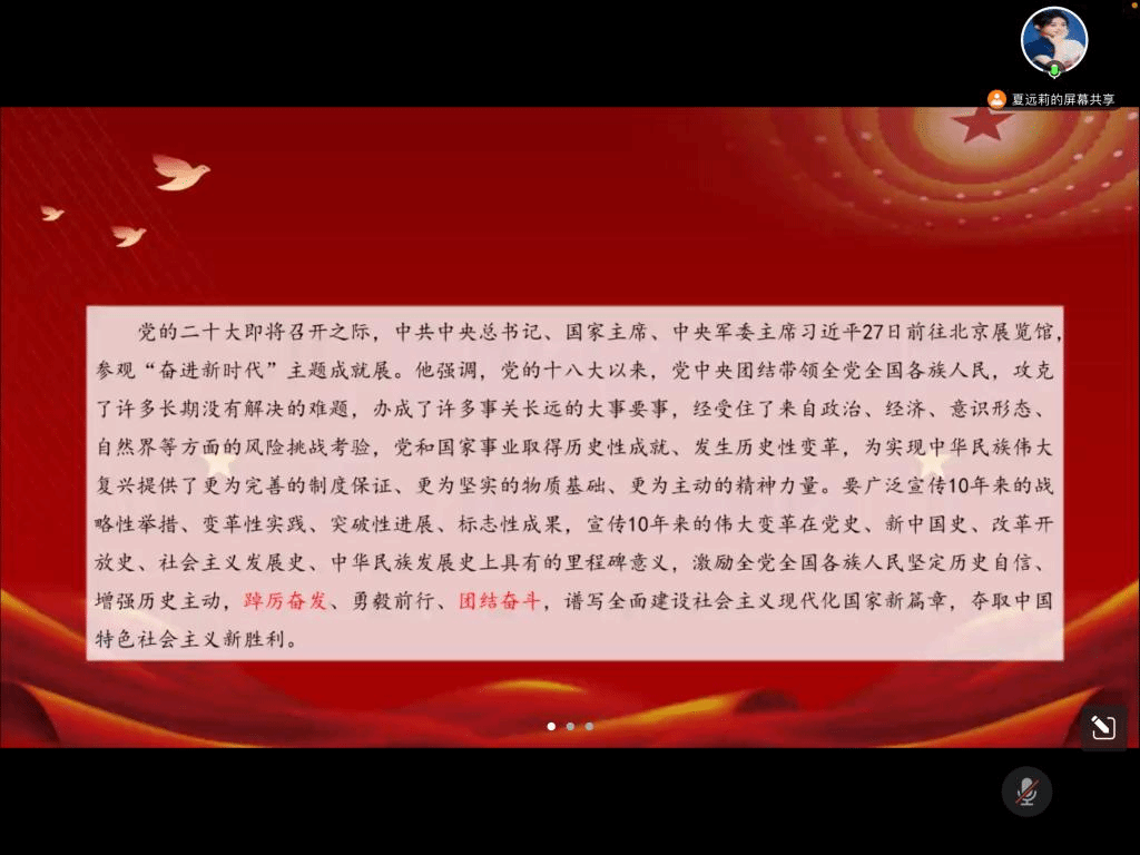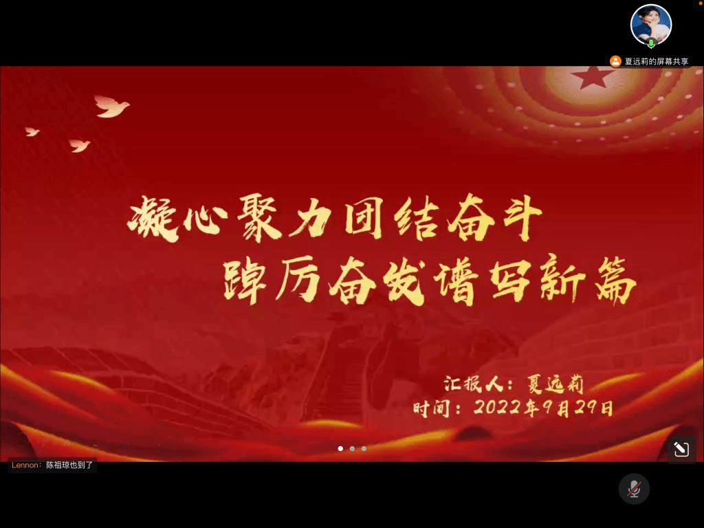 以迎二十大为契机,为加强理论学习,提升党员同志政治素养,增强党员的使命感和责任感,并把思想和行动统一到习总书记重要讲话精神上,万众一心,团结奋斗,锚定既定奋斗目标,意气风发走向未来。2022年9月29日19:00外国语学院学生党支部通过腾讯线上会议开展了“凝心聚力团结奋斗,踔厉奋发谱写新篇”党支部主题党日活动。