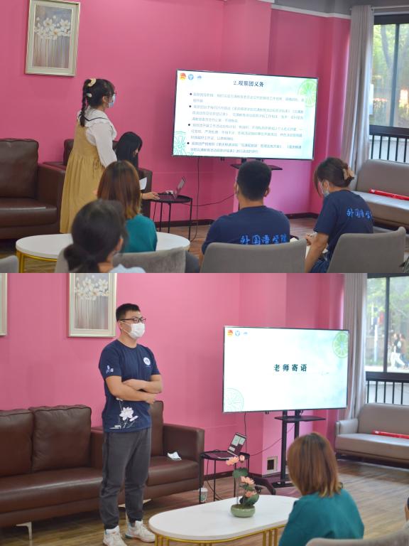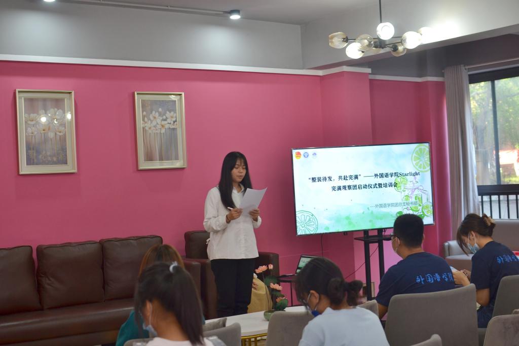 为让观察员们更好、更快的适应各项工作,了解观察团的工作与意义,融入团队,加强各成员之间的合作与交流。2022年10月19日下午17:00-18:00,外国语学院Starlight完满观察团全体成员在爱莲艺术交流室举行“整装待发,共赴完满”——外国语学院 Starlight完满观察团启动仪式暨培训会。此次大会邀请了外国语学院团总支书记吕戈老师、外国语学院艺术实践与修养板块及辅导员屠建丽老师,同时参会的还有完满观察团的全体成员。此次会议由贺桂担任大会主持人。
